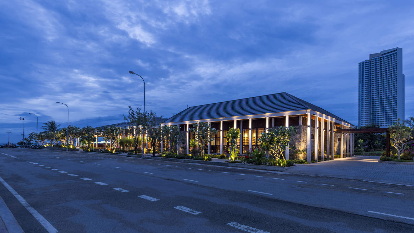 The design applies solutions from tropical-traditional architecture with buffer spaces created by corridors, canopies, and courtyards combined with gardens weaving into concrete columns and landscape lakes adjacent to the building.