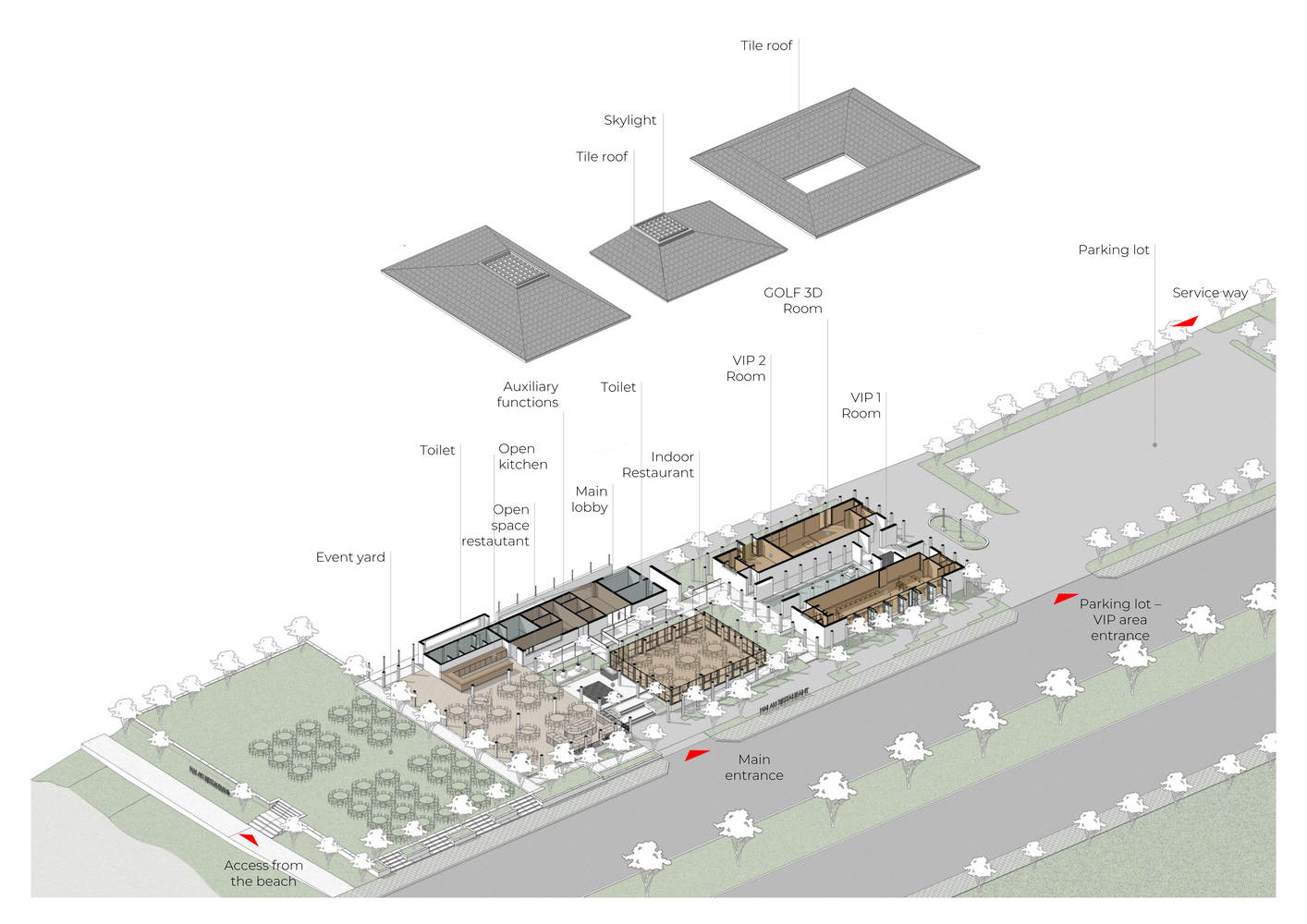 功能空间的布置在静态区域(贵宾室)和动态区域(开放空间餐厅区域和室内餐厅)之间形成了清晰的分隔。功能区之间穿插着绿色景观和水面,为隔热创造了缓冲空间,改善了微气候,节约了空间能源,增加了贵宾餐厅区域的私密性。