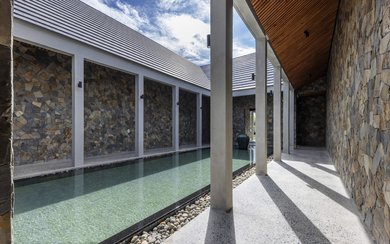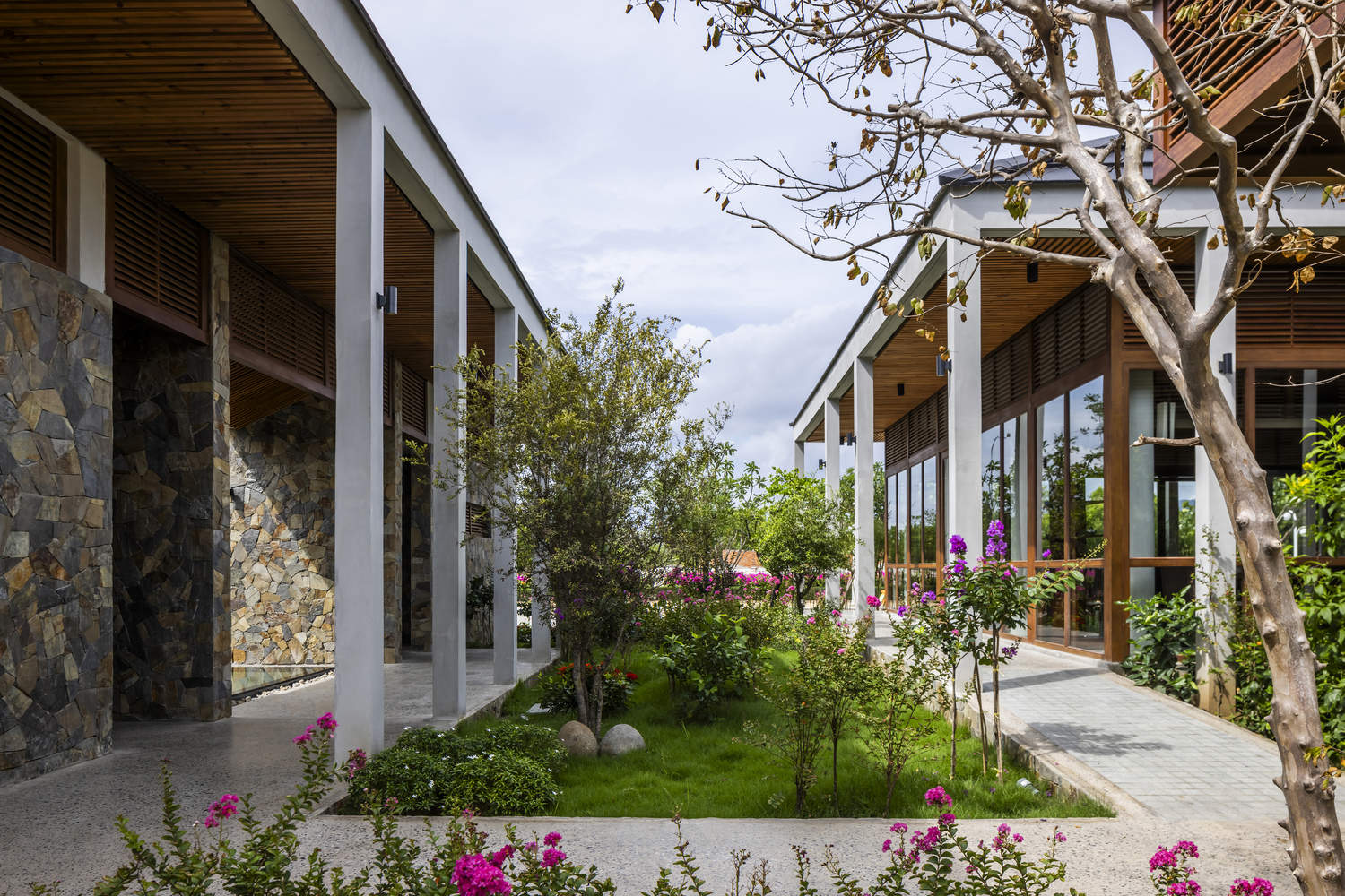 Natural materials such as locally sourced stone and wood, combined with the raw texture of exposed concrete, are crafted by the skilled hands of local artisans to create a space with a familiar atmosphere, reflecting the sense of place and the local community culture. The famous Bau Truc ceramics (Intangible Culture heritage_UNESCO 2022) from the Ninh Thuan region have been cleverly incorporated by the architect into interior and landscape spaces as decorative accents.