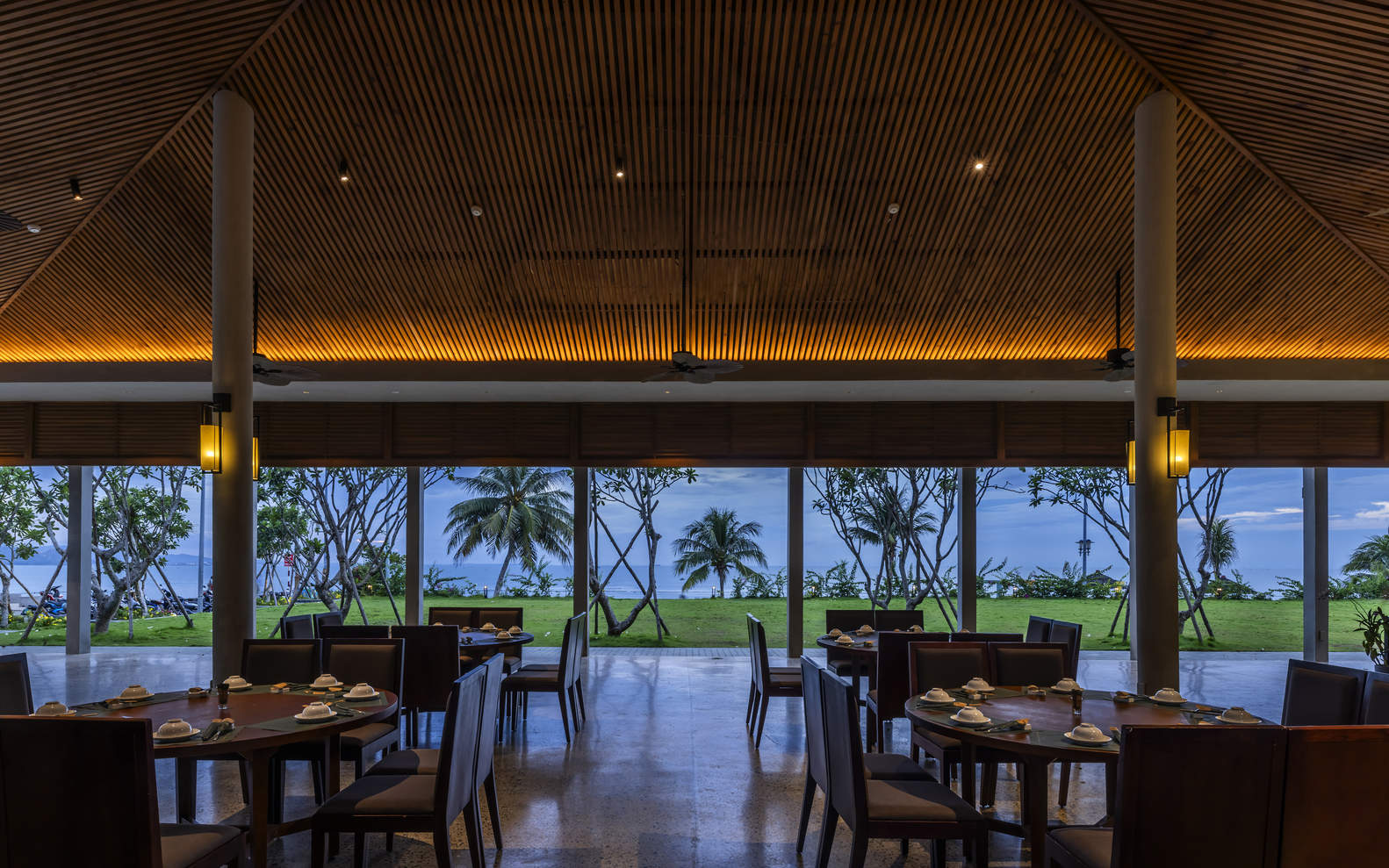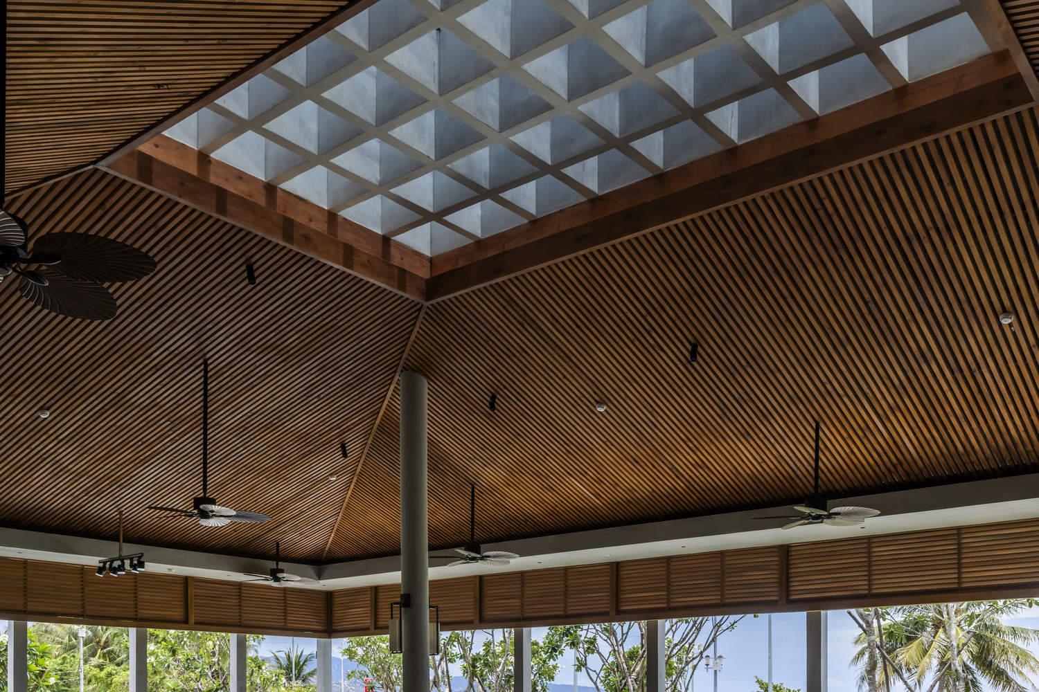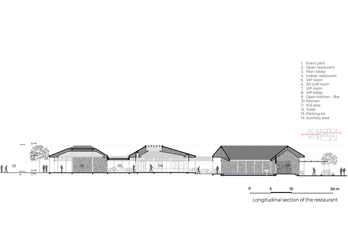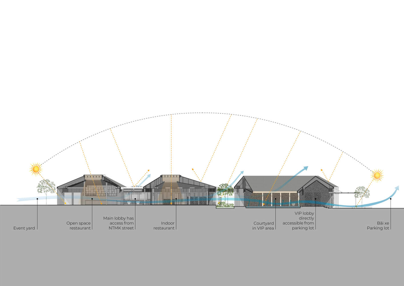The sloping roof form with high clearance height, and large space between concrete ceiling and wooden ceiling creates an effective insulation layer above the building. The skylight glass roof uses anti-radiation glass and a large enough height concrete louver system to create a unique lighting effect for the restaurant space.