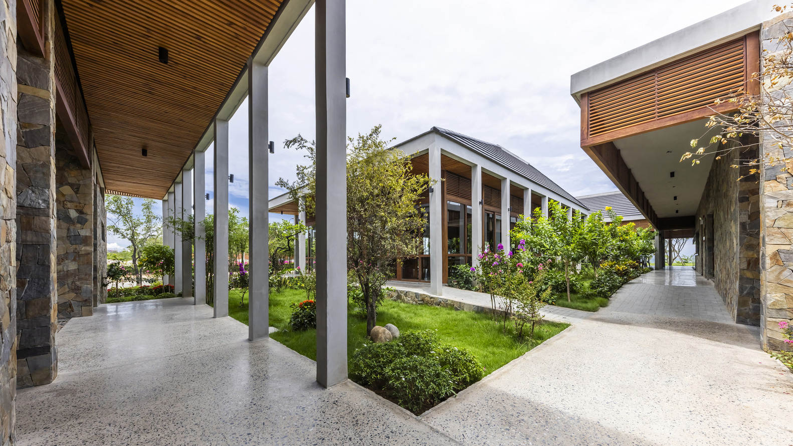 该设计采用了热带传统建筑的解决方案,走廊、檐篷和庭院创造了缓冲空间,花园交织成混凝土柱和建筑附近的景观湖。