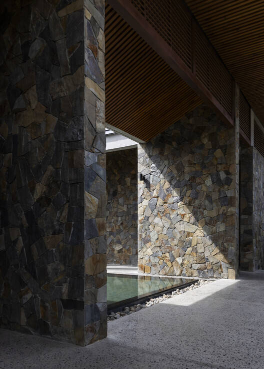 天然材料,如当地采购的石头和木材,结合裸露混凝土的原始纹理,由当地工匠的熟练双手精心打造,创造出一个具有熟悉氛围的空间,反映了地方感和当地社区文化。建筑师巧妙地将宁顺地区著名的Bau-Truc陶瓷(非物质文化遗产_UNESCO 2022)作为装饰元素融入室内和景观空间。