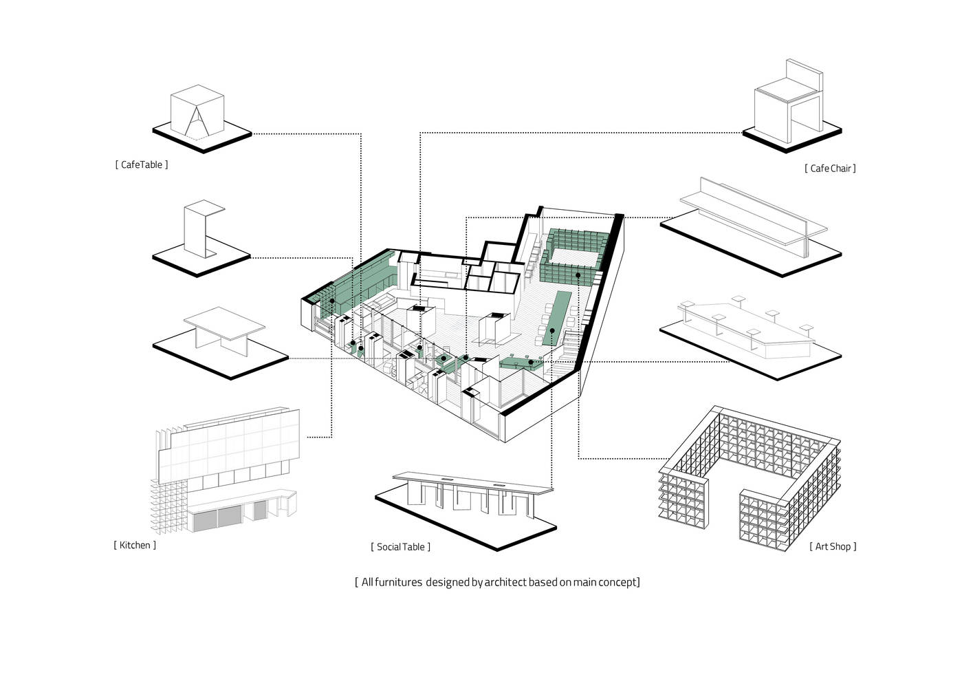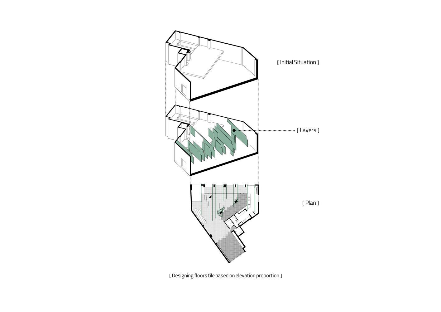 The porticoes here have a friendly construction not only with the passers-by and its inhabitants, but they have created a delicate co-embrace with their old building. The porticoes were born in their most delicate state and supported by stout columns, they ensured their survival. Their creation did not end with the connection between passing and passing, and this connection has expanded from passing to inside and all its internal layers. The result of this expansion and communication was the construction of self-made spaces whose creation and survival depended only on living together. The project was formed and evolved from layers, whose goal was not to be just a normal layer, but rather an opportunity to create a less space and maybe not experienced at all. The layers that create the scenario of pause, transition and space in a combined way from the outside to the inside of the building and vice versa. A bold look at the central view and the division of the entrance space in the "Z" axis, although the central layers divide the space in the "X" and "Y" axes, but in the central view, this division takes place in the "Z" axis, and also It changes the relationship of the space in the vertical relationship in an oscillation from the highest to the lowest height.