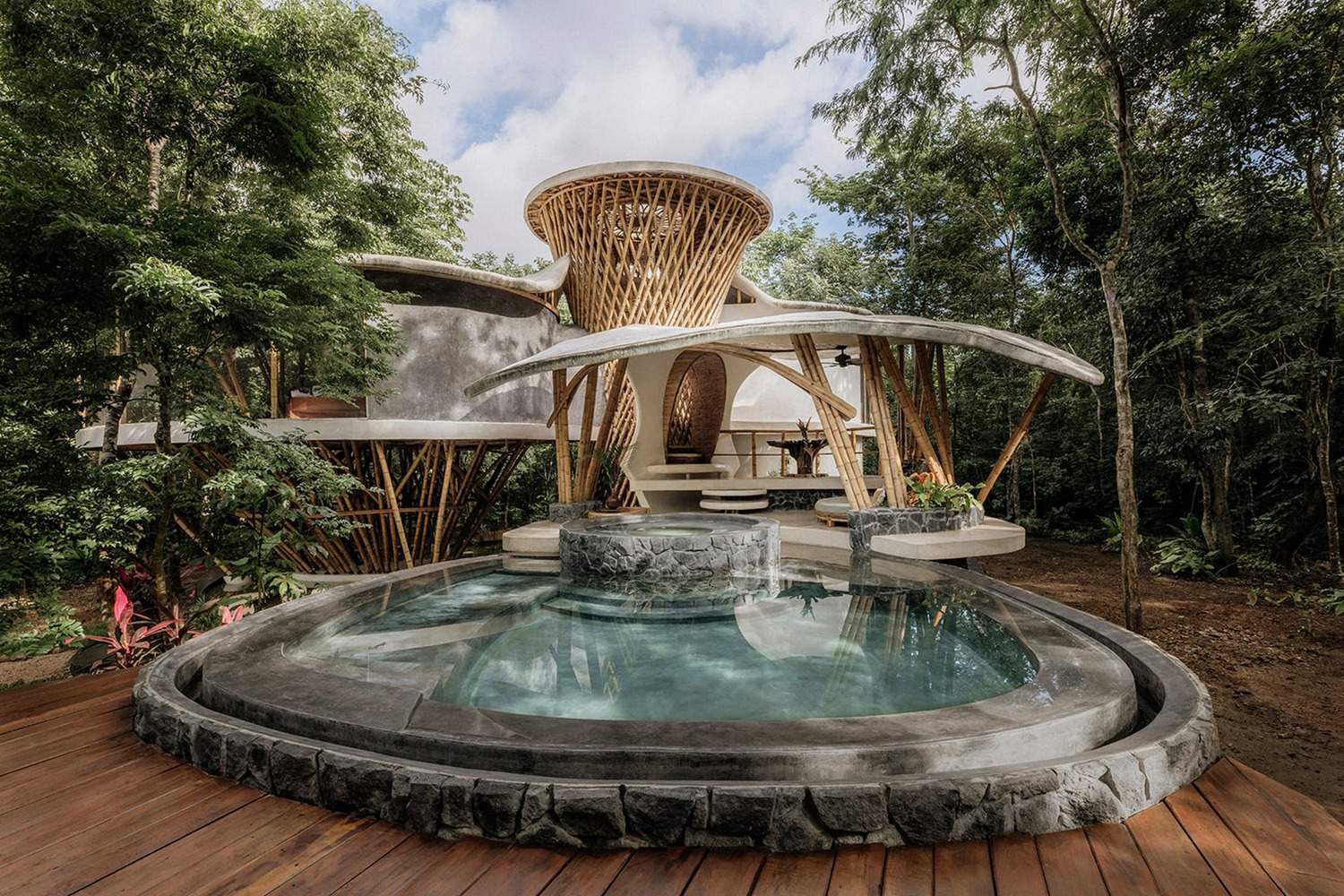 空间体验与环境互动:项目在空间设计上注重用户体验与自然环境的互动。从砾石小径与当地植被交织的入口,到水镜上悬挂的混凝土踏板路径,再到被竹圆顶环绕的楼梯,每个细节都引导人们在进入建筑的过程中沉浸于自然之中。主卧和次卧享有广阔的丛林景色,而社交区的游泳池、按摩浴缸和躺椅则进一步模糊了建筑与自然景观之间的界限,创造出一种无缝的流动感。这种设计不仅提升了空间的舒适性,还增强了用户与自然的联系。