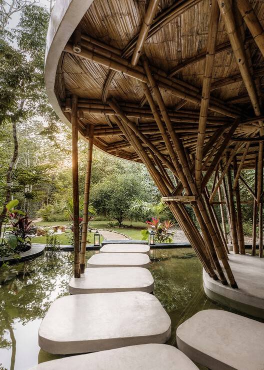 The project blends organic forms with a meticulous selection of local and sustainable materials. The structure is supported by bamboo columns, which distribute loads through carefully designed geometries. Concrete slabs, inspired by the petal's form, shape the roofs and floors, while walls are clad in regional plaster and stone. These finishes ensure durability while achieving a harmonious integration with the environment.