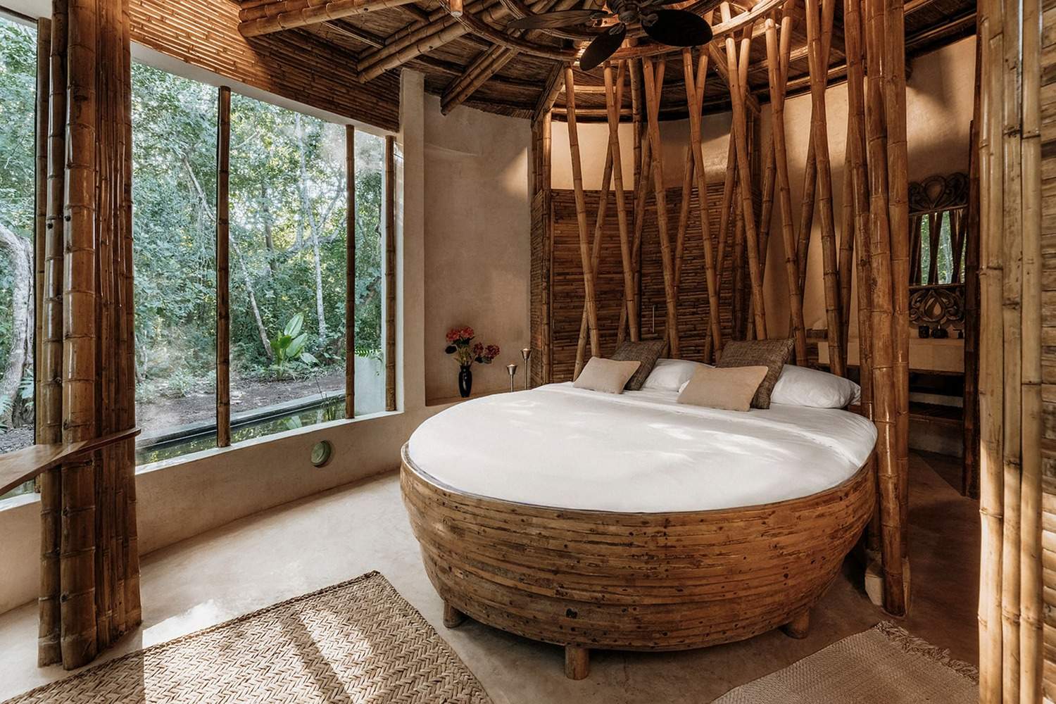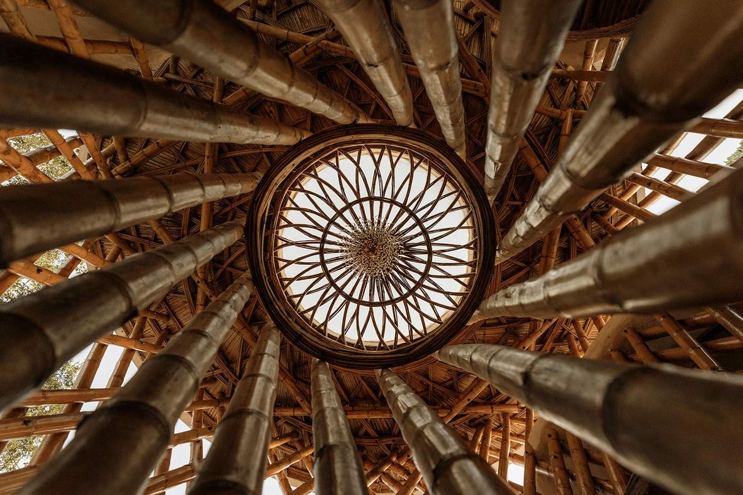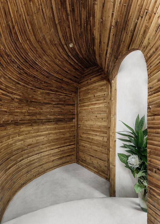 From the main lobby, a staircase enveloped by a bamboo dome ascends to the master bedroom. This dome, both a structural and aesthetic element, allows natural light to flood the stairs, emphasizing the connection between interior spaces and the surrounding environment.