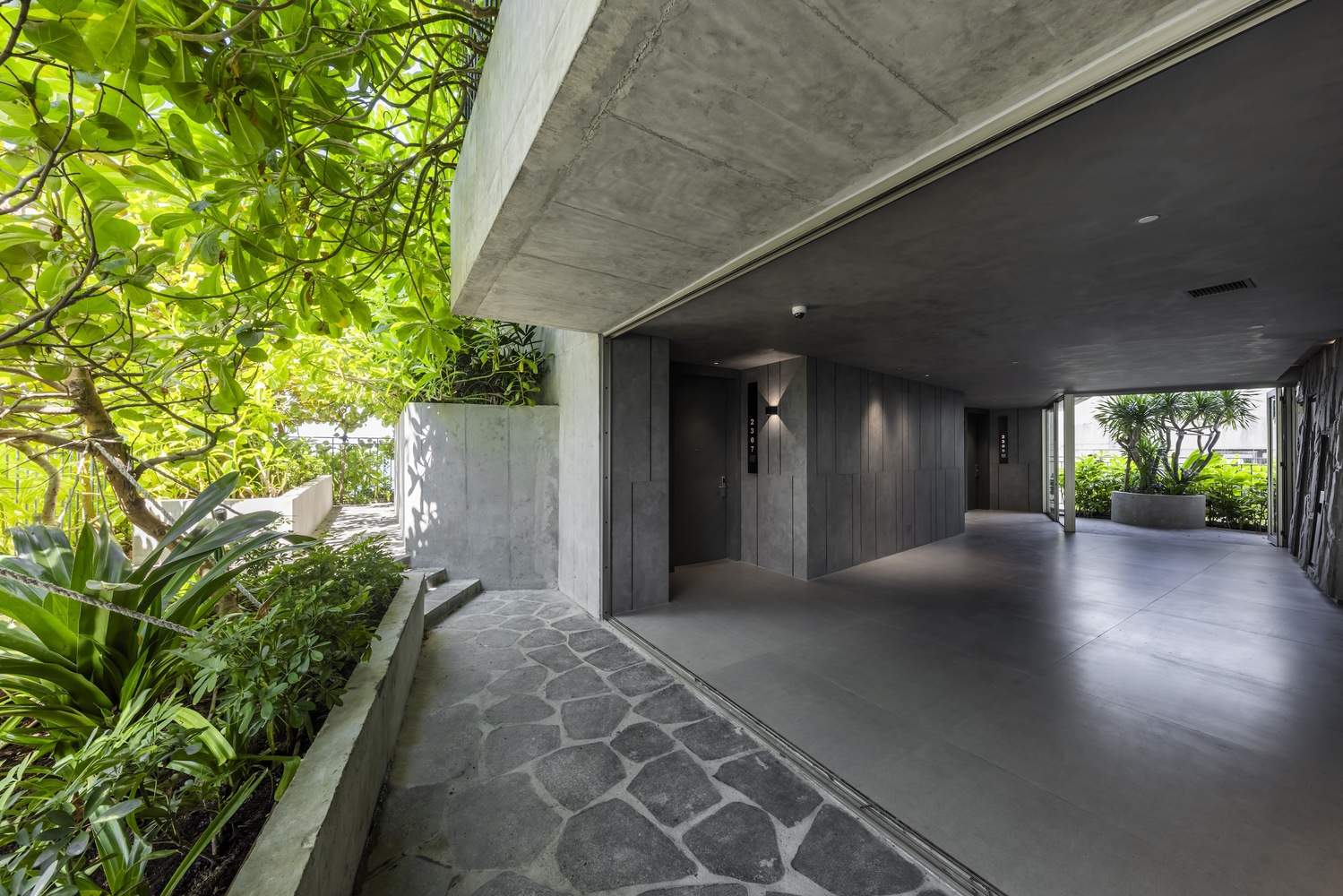 M Hotel is designed with the concept of a flowing stream on the surface of a rocky mountain. The fair-faced concrete material evokes the image of a sturdy structure, resembling a majestic mountain mass in nature.Meanwhile, the flowing stream is represented by winding, curving lines of greenery, seamlessly intertwined with the building. This approach creates a harmonious architectural ensemble, blending beautifully with the natural surroundings in the urban coastal landscape.