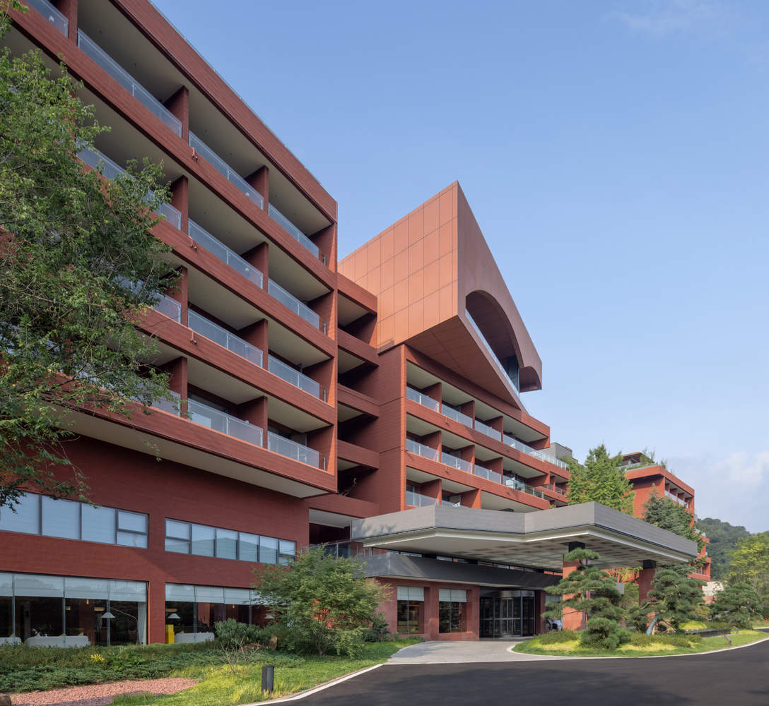 当你透过森林的缝隙看时,可以看到建筑顶层的“山影堂”。它从整个建筑中脱颖而出,就像一只挂在从建筑上拆下的树枝上的鸟。这是这座红砂岩般建筑的第一印象。当红色的建筑从红砂岩的巨石上升起时,我们进入了它。问题2:什么样的特征使酒店完美?该建筑被切割成四个独立的街区,并根据地形和景观进行轻微旋转,使每个街区都有自己的方向感和独立性,同时体积也减小了。