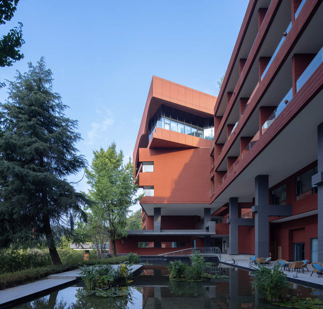 When you look through the gaps in the forest, "The Mountain Shadow Hall" on the top floor of the building can be seen. It stands out from the whole building like a bird hanging from a branch that has been detached from the building. This is the first impression of this red sandstone-like building.When the red building rises from the boulder of red sandstone, we enter it. Question 2: What kind of features make a hotel perfect? The building was cut into four separate blocks and slightly rotated according to the topography and the view, so that each block has its own sense of direction and independence, and at the same time the volume is reduced.