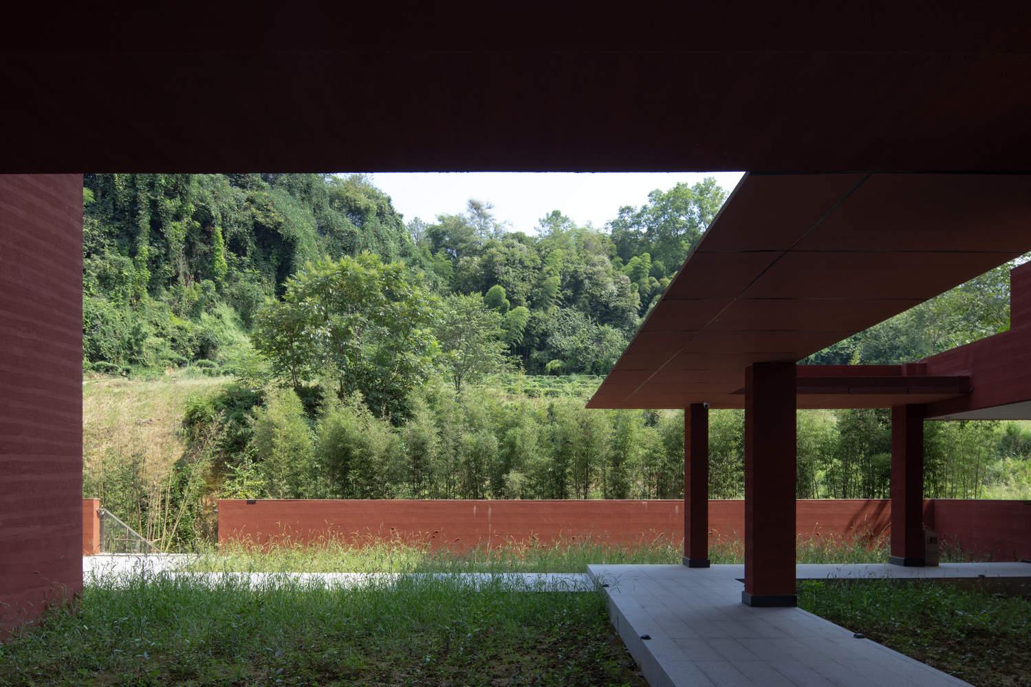 Text description provided by the architects. Lao'e Mountain is on the southwest edge of Chengdu Plain, as if the red sandstone under Chengdu Plain suddenly rises up, and the altitude directly rises to 1100 meters. There are osmanthus trees in rows, bamboo forests, and tea fields on the mountain, making the site a beautiful environment.The site of the project is a flat land halfway up the mountain, which was a guest house for the government before. The north is against layers of tea fields while the south is towards the open view of the valley. The unfolding red sandstone is like the Buddha lying down, so some people call it the "Sleeping Buddha". The mountain, the valley, the surrounding tea field and the smoke from fires all show the quietness far from the cities.