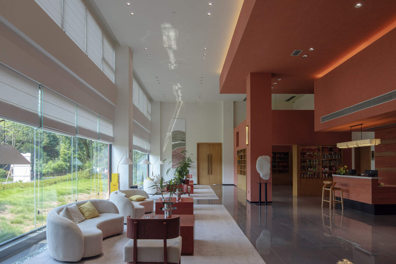 The first floor is the public area, where the conference center, lobby, concierge entrance, café bar and restaurant are lined up. Because of the existing topography, each part of the function has a different height, forming its own space with its own sense of domain and uniqueness. All the guest rooms between the ground floor and the top floor public area have a view of the open refreshing landscape. The corridors are surrounded by tea fields and bamboo in the back of the mountain, which is full of security.