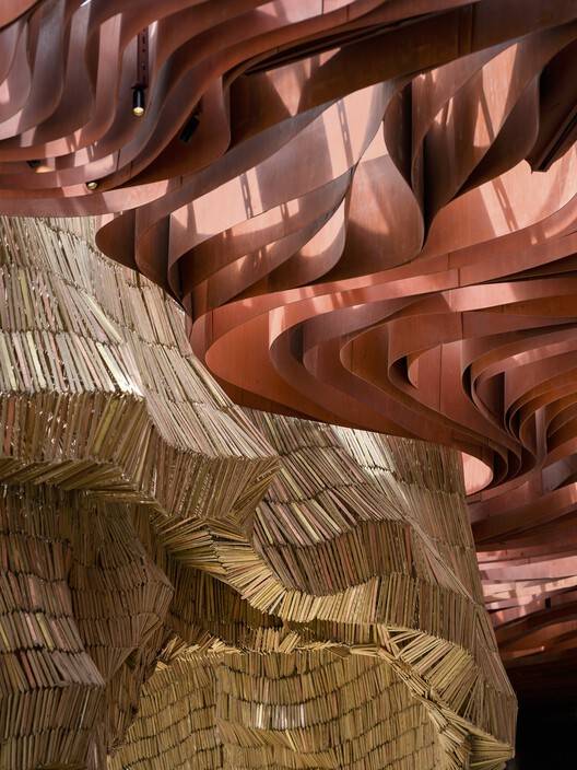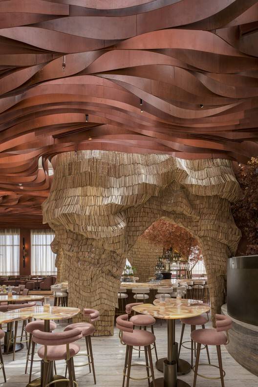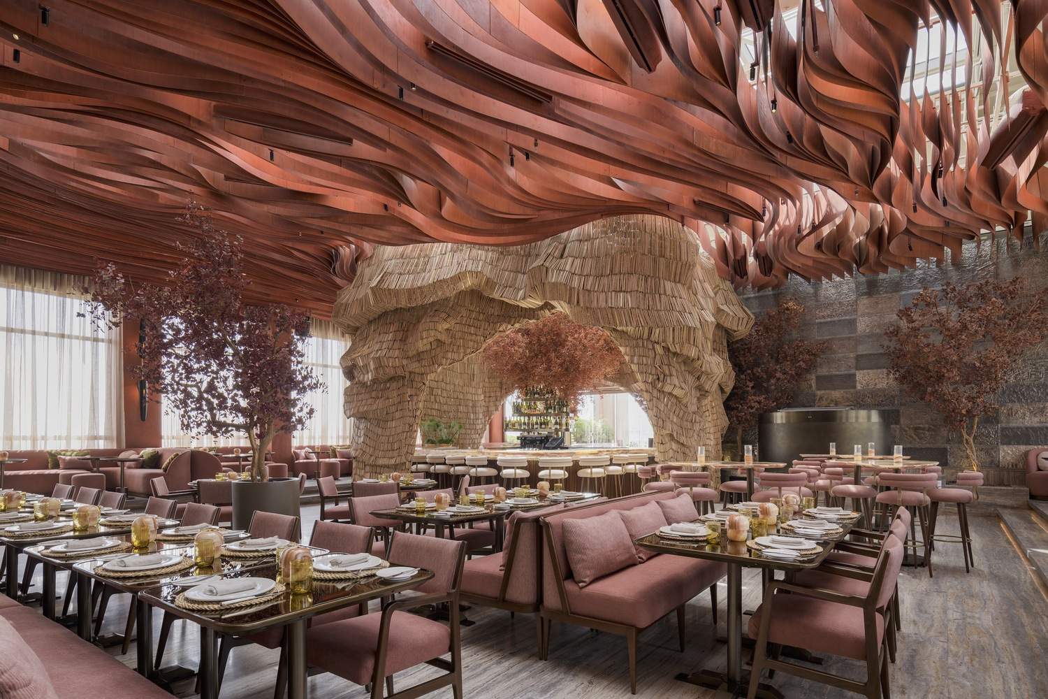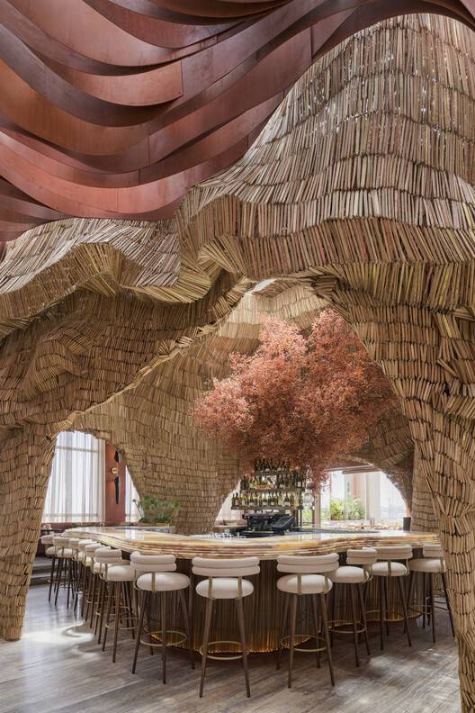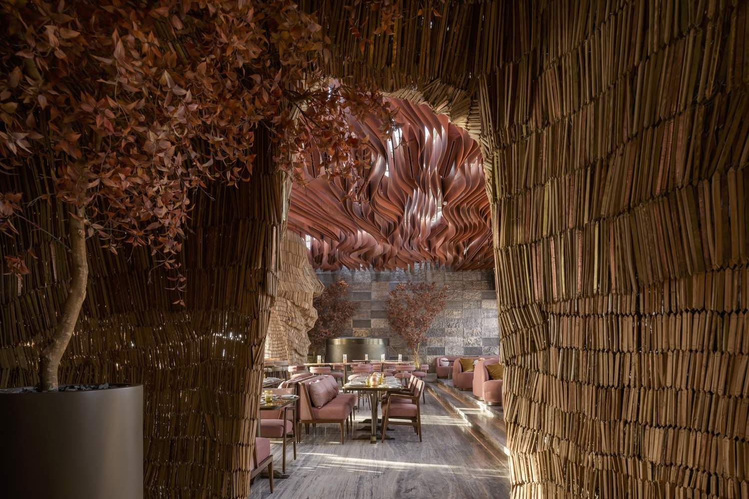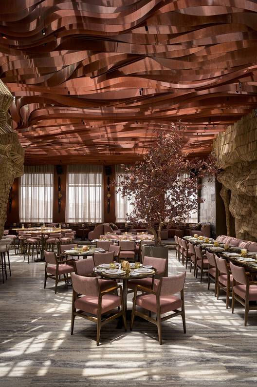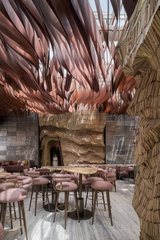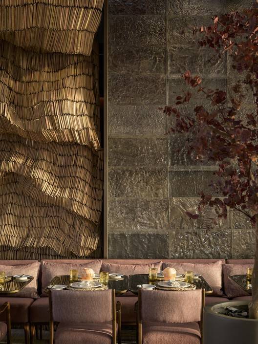 The engineering background particularly gives her a deeper intuition of possibilities, in the potentiality of making and not only design. The pinkish terracotta walls and surfaces resemble poured concrete, giving an unfinished look or a foundational feel, highlighting the boundaries and the perimeter of the space and framing them. The ridged effect on the walls is a mixture of mud, natural color pigments, hay, and local earth hand-combed by artisans working on site from top to bottom, the imperfections in it are also an expression of the hands of the artisans that had crafted it. the clientele's experience of elegant space, a possibility to touch, feel, and contemplate the multiple subtle material variations of textures and colors. palm straws have a natural color, brass and copper, terracotta clay color, and alabaster Egyptian store golden color, glass cooling effect with its tint of patina to give a silvery/champagne color like old mirrors. all these materials and colors were produced and fabricated by the hands of very talented a big group of Artisanal and craftsmanship.