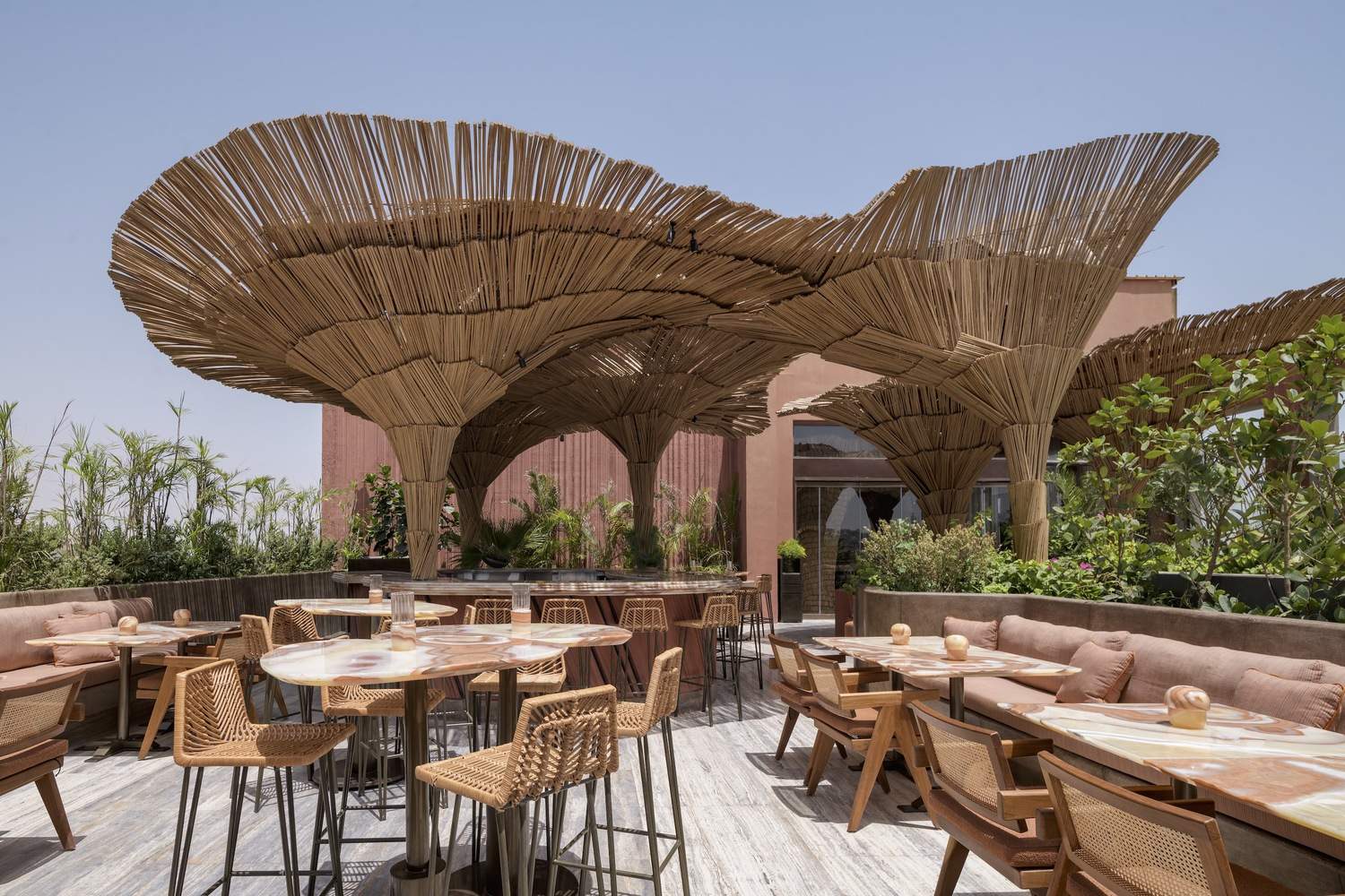 the organic amorphous structure is made almost entirely with Jereed ElNakhl, palm leaves/straws, weaved in an unobstructed presence that never clears the space, yet encircling the trees and a long undulating curvy continuous bar that seems like it has emerged from the ground to rest here for a moment. This feature which forms the loci of the project is shifted from the center of the room, like a human being's heart not quite placed in the center. and as it anchors the space, it also forms a gateway to the terrace, linking the outside to the inside, on the horizontal plane and as well the vertical, by its opening up to the sky above. This is where everything occurs, a togetherness around this continuous table like a bar with its offering of food and drinks and a place of respite, grounds us, connecting us, wrapped with this Egyptian date palm straw leave lace, connecting us to the past, heritage, crafts, locality, to facilitate a sense of protection and sense of being at home. the oculus in the roof of this structure, through which natural light filters inside, and the way the sun outside fractures the perforated palm straw lace (jereed ElNakhl) walls. In this rooftop project Fahmy's idea of an architecture that doesn't forget its foundational responsibility, to provide shelter, a roof, an enclosure, a boundedness, maybe even warmth, maybe even a togetherness with serving a bit of food.