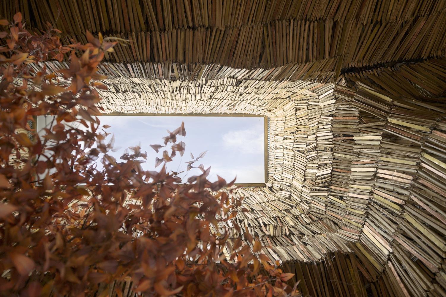 有机无定形结构几乎完全由Jereed ElNakhl、棕榈叶/稻草制成,编织在一个无障碍的存在中,永远不会清理空间,但环绕着树木和一个长长的波浪形弯曲的连续条,似乎已经从地上出现,在这里休息了一会儿。形成项目轨迹的这一特征从房间的中心转移,就像一个人的心脏没有完全放在中心一样。当它锚定空间时,它也形成了通往露台的门户,通过向上方的天空开放,在水平面和垂直面上将外部与内部连接起来。这就是一切发生的地方,围绕着这张连续的桌子,就像一个提供食物和饮料的酒吧和一个休息的地方,把我们联系在一起,用这种埃及椰枣草叶花边包裹着,把我们与过去、遗产、手工艺、地方联系起来,以促进一种保护感和宾至如归的感觉。这座建筑屋顶上的眼孔,自然光通过它过滤进来,外面的阳光破坏了穿孔的棕榈草花边(jereed ElNakhl)墙。在这个屋顶项目中,法赫米的建筑理念是,它不会忘记自己的基本责任,即提供庇护所、屋顶、围栏、有界性,甚至可能是温暖,甚至可能提供一点食物。