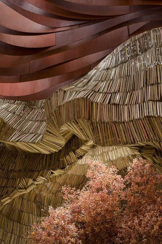 材料的诗意表达与可持续性: 项目在材料选择上展现出对可持续性的深度思考。设计师大胆采用当地材料,如粉色的赤陶墙、棕榈吸管等,营造出质感丰富的空间体验。这些材料本身就带有独特的色彩和肌理,在光线的照射下产生丰富的视觉效果,并与周围环境和谐共生。设计师也展现了对材料的深刻理解,将它们转化为具有诗意的表达。同时,这种对当地材料的选用,也减少了对环境的负面影响,体现了可持续发展的理念。这种设计手法不仅提升了项目的独特性,也赋予了空间独特的生命力,实现形式、功能和结构之间的和谐。