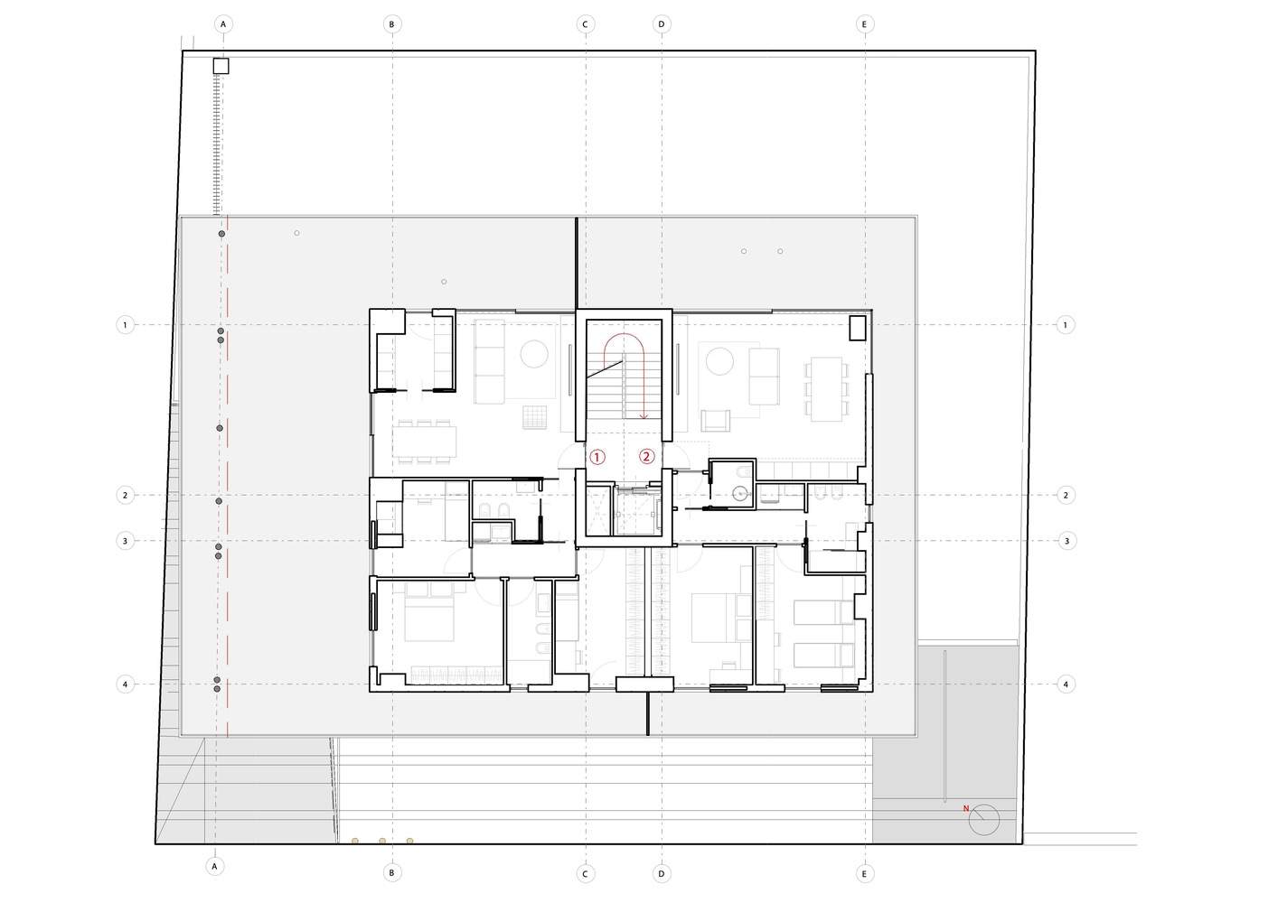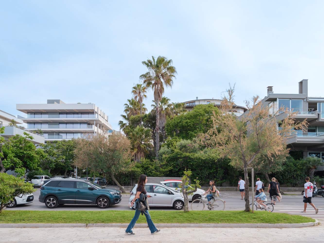 This new work by Giovanni Vaccarini is located on the corner of an urban block near the coast, just a short distance from the central Piazza Salotto. Surrounded by treelined avenues and several architecturally significant buildings, the palazzina at Via De Amicis embodies a contemporary vision with a strong emphasis on connecting with the surrounding urban fabric and public space. The building emerges as a series of stacked planes with lush terraces that fully encircle the apartments, projecting toward the city in multiple directions. The inhabited spaces seem to expand centrifugally around the building's central core, which has a minimal footprint at ground level, creating a dynamic interplay of extension and contraction. This configuration takes advantage of sightlines and establishes visual and spatial connections with the surrounding area, creating an engaging, outward-looking relationship with its environment.