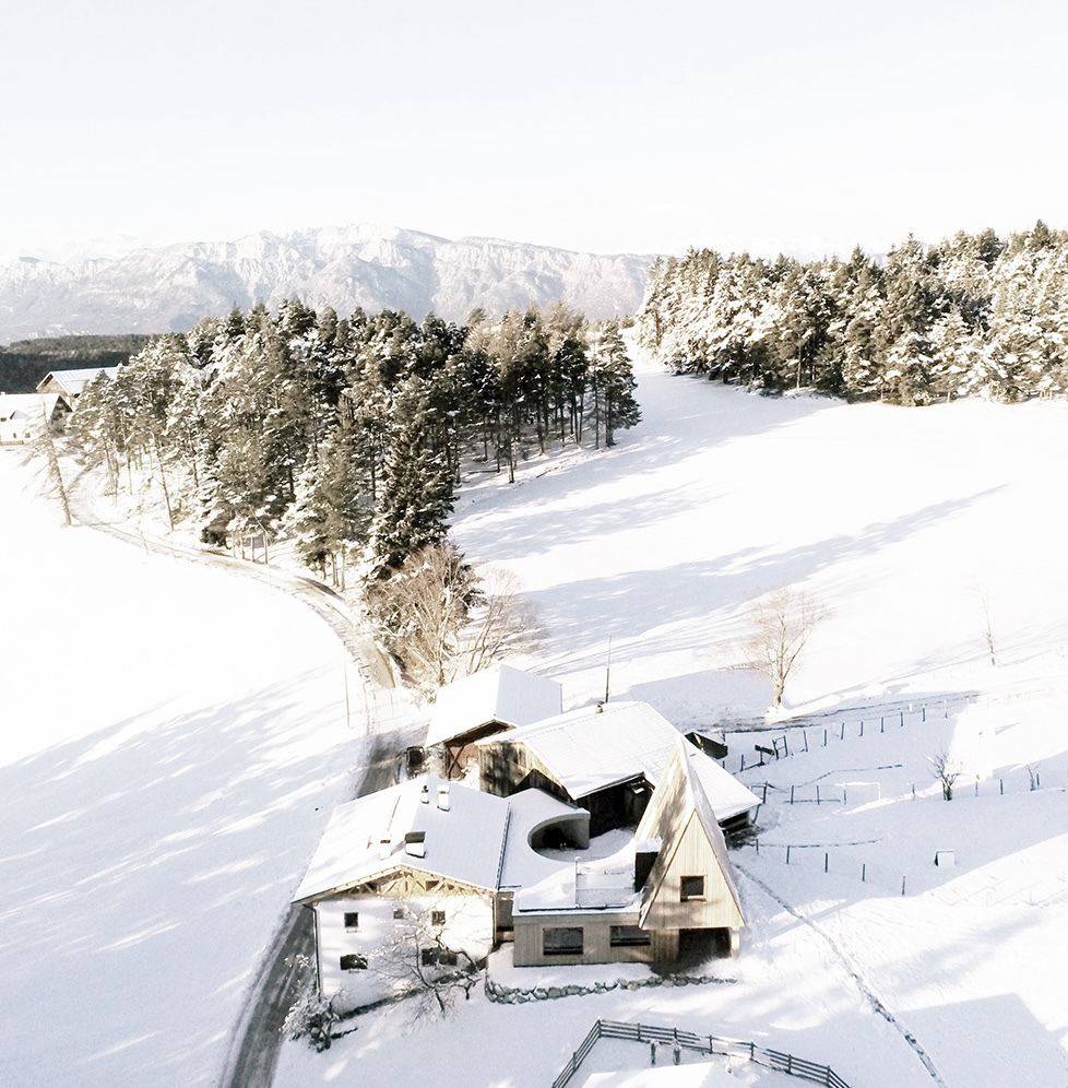 Project - The design is rooted in a simple yet powerful idea: to expand the farmhouse by adding a new volume alongside the existing one, preserving its characteristic form, geometry, and proportions. Following traditional practices, the extension grows horizontally rather than vertically, deliberately distinguishing itself from the original structure. A round patio mediates the transition between old and new, symbolising the union of past and future. This central space becomes the heart of the project—an enclosed yet open area where the vast landscape is framed, embracing the sky within a perfect circle. The connection between the old and new volumes is articulated through a flat-roofed structure, which houses the main entrance. A staircase, enclosed between two walls, guides visitors from the farmhouse's historic entrance up to the serene space of the patio. From here, an internal distribution corridor separates the living and sleeping areas. The former sleeping quarters within the historic farmhouse are transformed into living spaces, with all existing openings preserved. A central core is introduced, housing a stove, kitchen, pantry, and a staircase leading to an alpina architects mezzanine in the attic. From this elevated space, once sealed-off gable ends are now glazed, framing panoramic views of the surrounding mountains.