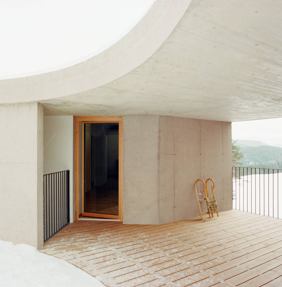 材质对比与空间体验:项目在材料的选择上独具匠心,延续了当地传统农舍的特色。木材被广泛应用于结构和覆层,营造出温暖舒适的氛围,而未经处理的落叶松板条随着时间的推移会自然地变成银灰色,与周围环境融为一体。与木材形成对比的是,基础、平顶连接和露台采用了喷砂暴露的混凝土,这种处理方式赋予了混凝土原始的质感,让人联想到天然石材。这种材质的对比,以及圆形露台带来的开放与封闭的结合,营造出丰富的空间体验,使居住者在室内外都能感受到与自然的紧密联系。