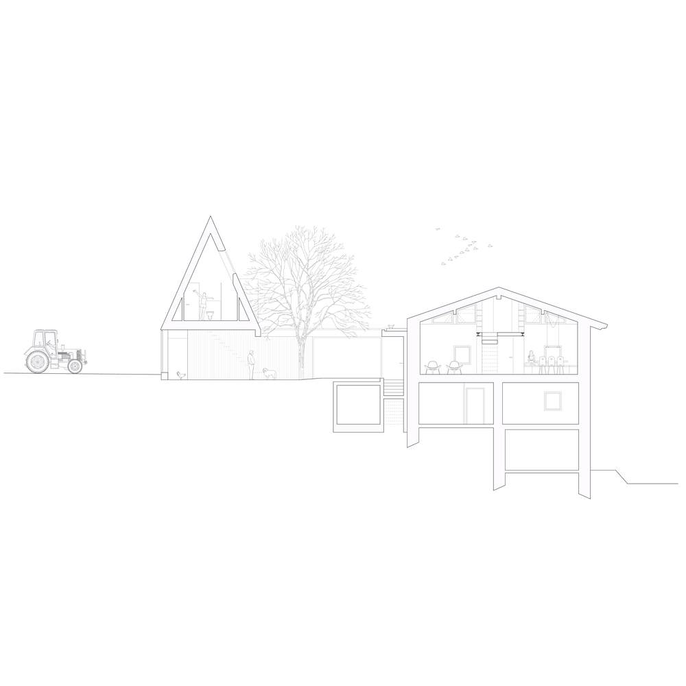 Settlement Concept - The project began with a careful analysis of the existing structure, the built context surrounding the farmstead, and the landscape in which it is deeply rooted. Initial design attempts followed the client's suggestions, including plans to raise the roof to create additional living space. However, it soon became clear that this approach would disrupt the proportions of the farmhouse, diluting its original character and stripping it of its innate grace. A new approach was needed—one that would address the functional requirements without compromising the essence of the existing structure. After extensive research and conceptual sketches, an alternative solution emerged: rather than building upwards, the design capitalised on the natural slope of the terrain to introduce a new volume at the level of the farm's upper floor, which was traditionally used as a sleeping area. Like a carefully grafted extension, the new structure anchors itself to the existing building, generating something entirely new. While internally connected to the farmhouse's second floor, the addition extends northwards, maintaining a delicate balance between integration and separation. A circular patio is introduced between the old and the new, acting as a transitional space. Within this composition of interconnected volumes, it became evident that the new home needed its own distinct identity—a new chapter in the story of BS Hof. The resulting design presents a striking triangular form, evoking the archetypal shape of a hut. It rises from the landscape with clarity and confidence, declaring: I am here too.