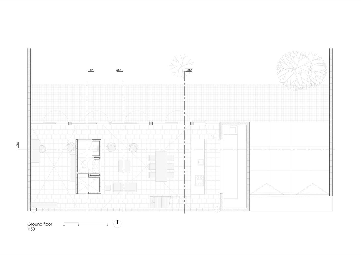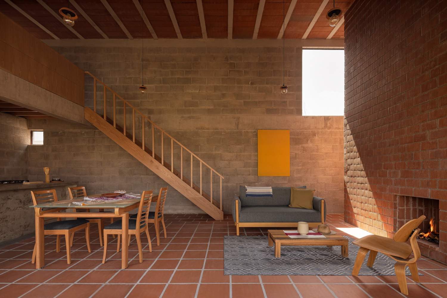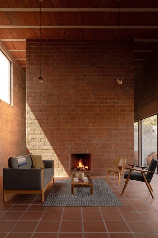 This volume aligns with the street front and opens onto the spacious backyard garden. Inside this space, there is another rectangular prism made of ribbed industrial brick, which houses the service areas (bathroom, water storage, and fireplace).