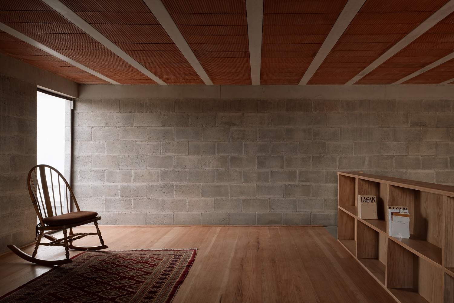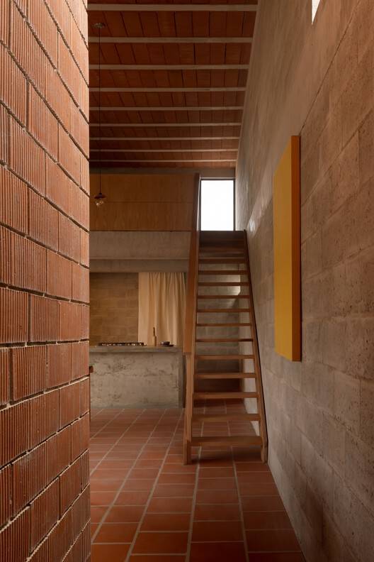 The rest of the space is an open floor plan that accommodates the home's public areas: study, living room, dining room, and kitchen. Above the kitchen, a wooden loft contains the bedroom. The roof slab is constructed using a system of prestressed beams and industrial ceramic coffers, while the ground floor features industrial ceramic tiles.