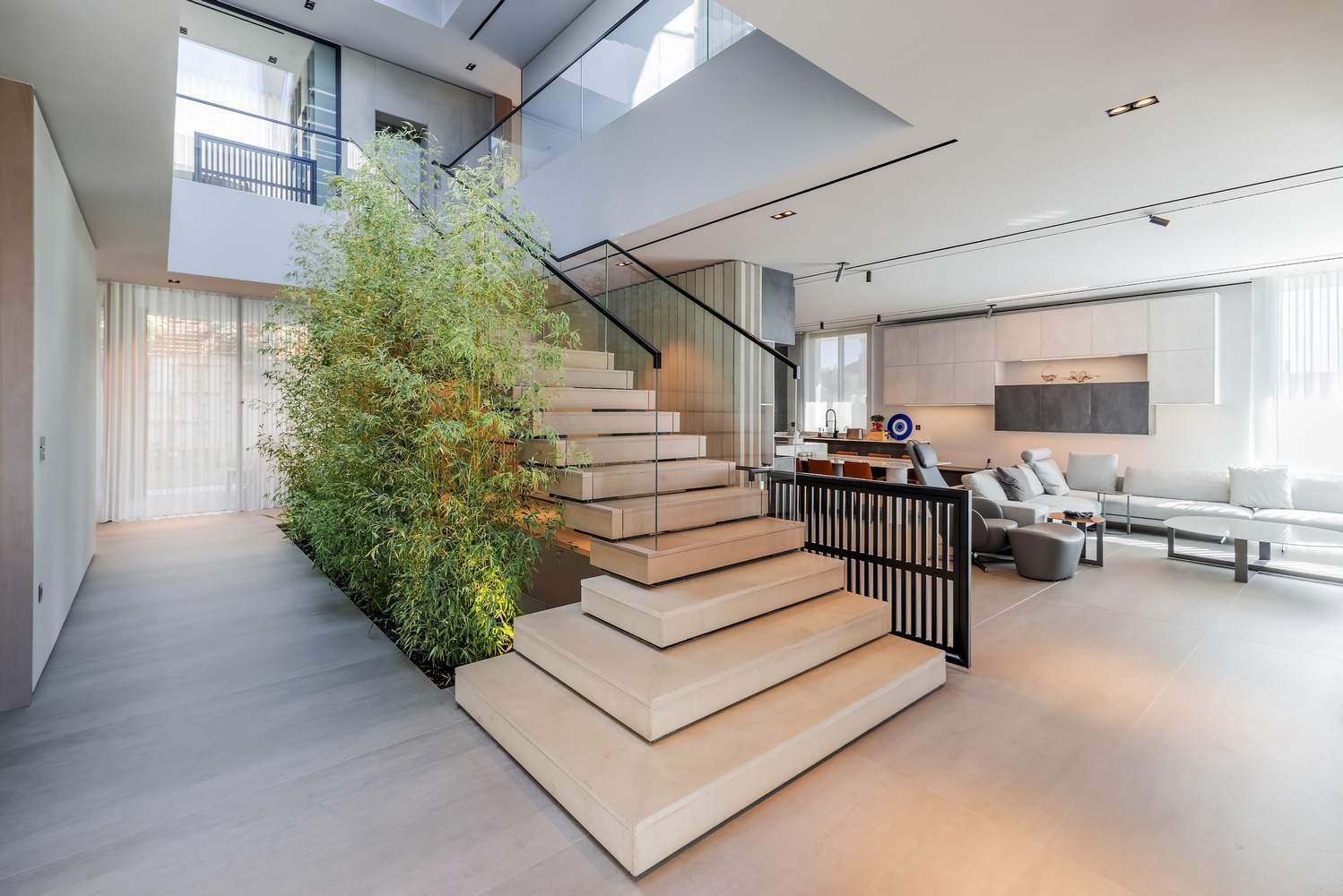 这座住宅地理位置优越,可以俯瞰令人惊叹的景色。宽敞的全景窗户和阳台被包裹在光滑的金属框架中,可以不间断地欣赏周围的风景。外观是天然石材的精湛组合,精心切割成三角形元素。这个几何立面充满了阳光和阴影的相互作用,创造了一种既现代又永恒的迷人视觉节奏。