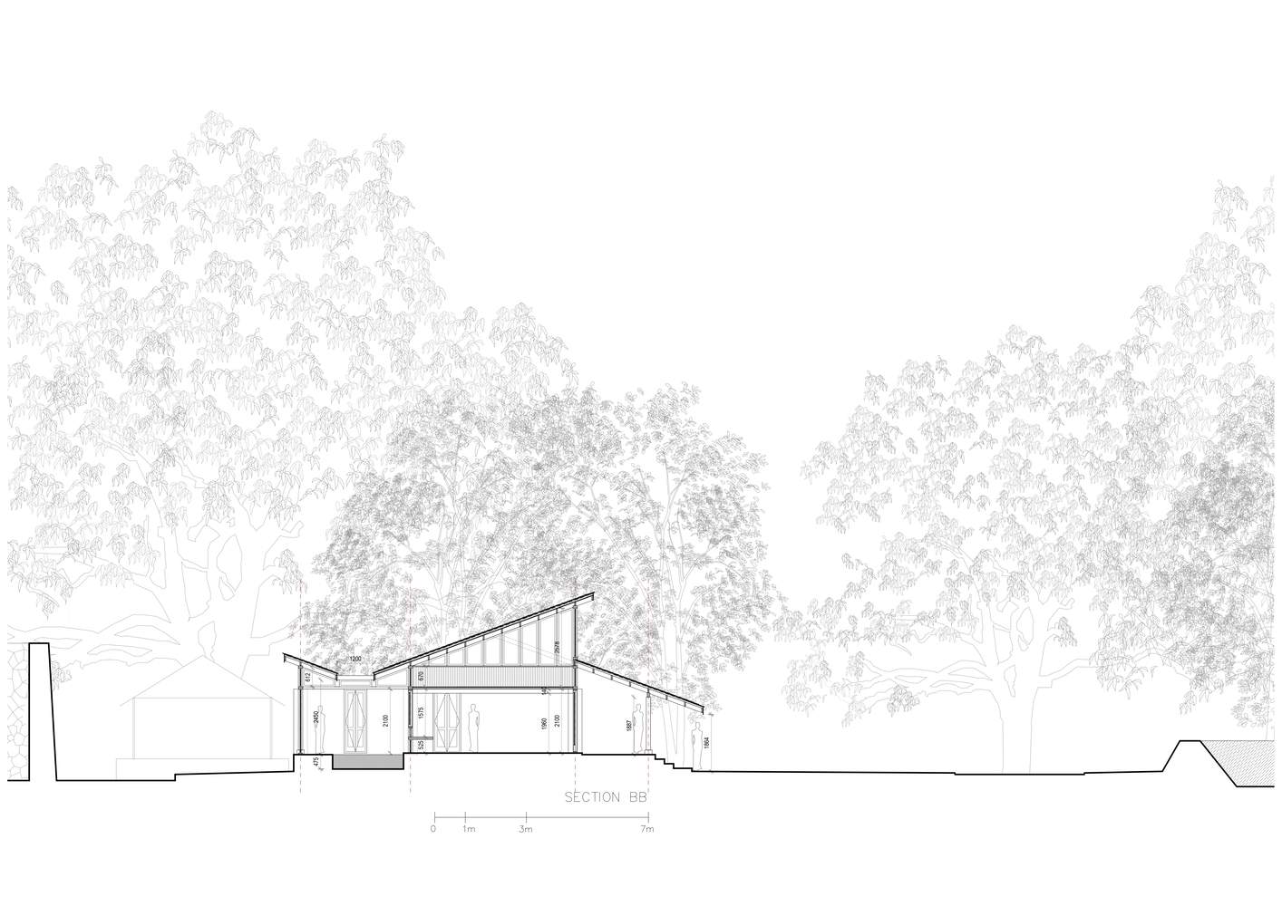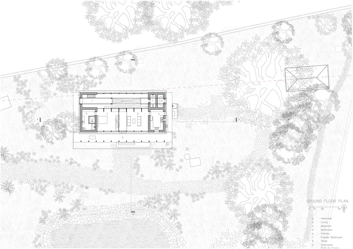 农舍坐落在一片杜鹃林中,屋顶高耸于树梢之上,朝向农场,在一个以极端高温和降雨为特征的地区,受益于柔和的北极光。中央海湾北侧有一个深阳台,南侧有一个较窄的阳台,环绕着一个庭院和水景,可以有效地控制气候,促进自然空气流通。