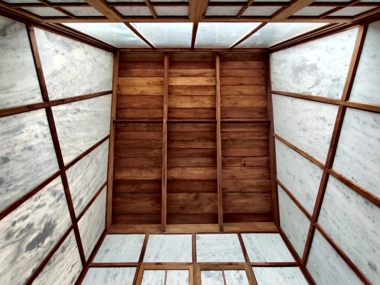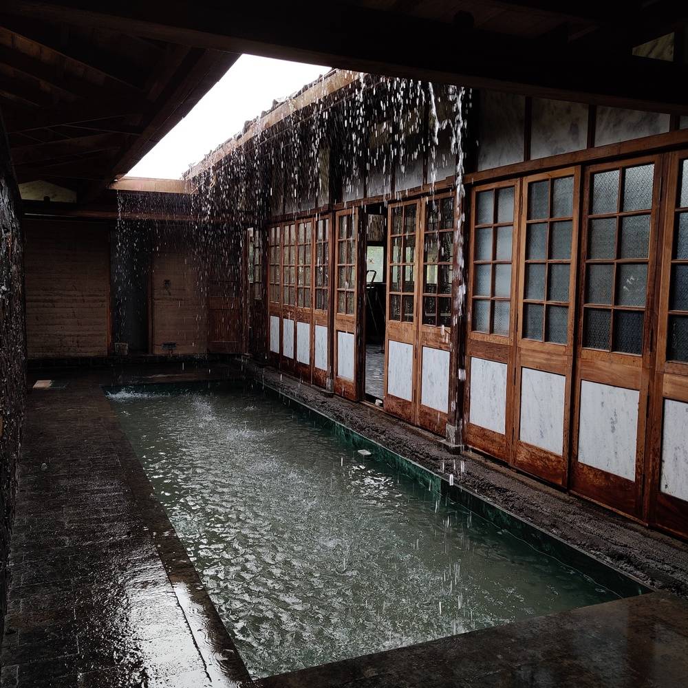Nestled amidst a grove of chickoo trees, the farmhouse featured a roof soaring above the treetops, oriented towards the farm and benefiting from the gentle north light in a region characterized by extreme heat and rainfall. The central bay is flanked by a deep veranda to the north and a narrower one, enclosing a courtyard and water feature, to the south, enabling effective climate control and promoting natural air circulation.
