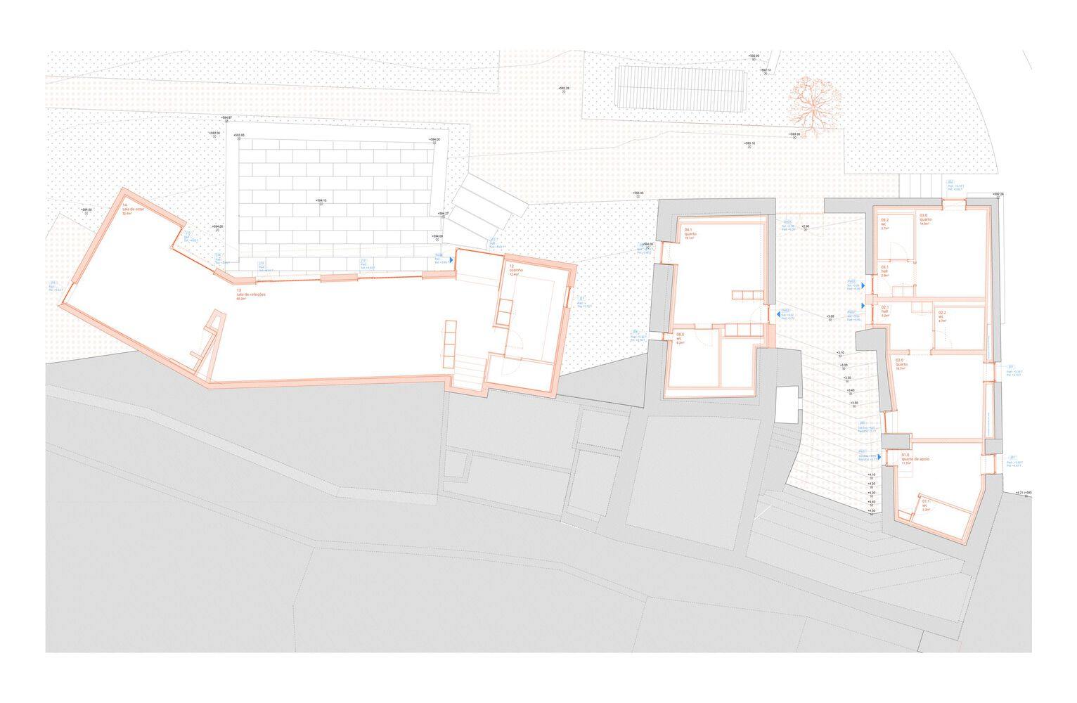 The house (A) is fully restored, taking advantage of the existing structure, installing the main program - the core of rooms - suitable both for the size of the existing spaces, as well as for the distribution made through the gallery around the patio. The restoration included the reinforcement of the granite masonry, the introduction of structural wooden slabs, plasterboard walls inside, thermal insulation and wooden exterior window frames and the reconstitution of a roof with a new wooden structure and marseille tile.