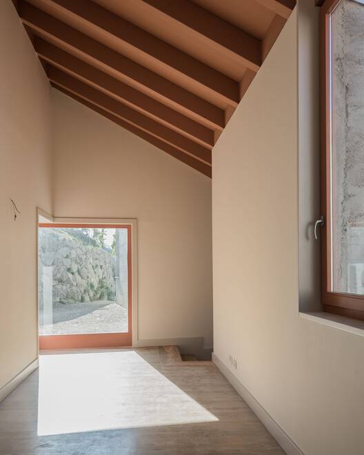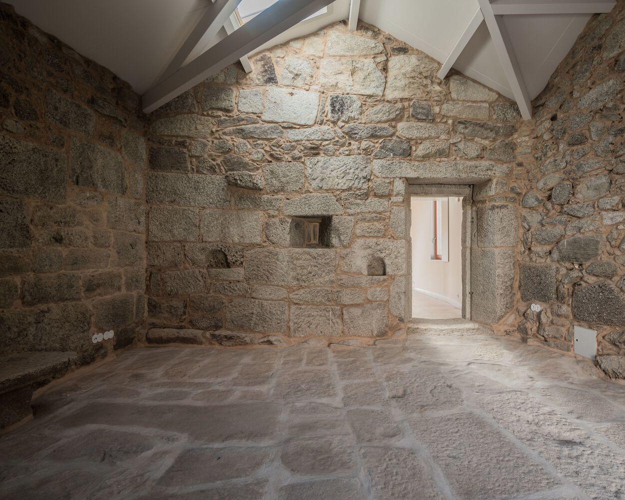 房子(A)经过全面修复,利用了现有的结构,安装了主程序——房间的核心——既适合现有空间的大小,也适合通过露台周围的走廊进行分配。修复工作包括加固花岗岩砌体,引入结构木板、内部石膏板墙、隔热和木制外窗框,以及用新的木结构和马赛瓦重建屋顶。