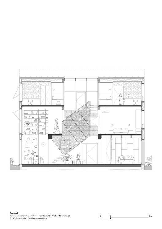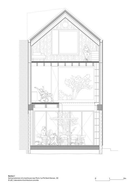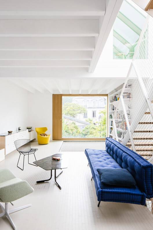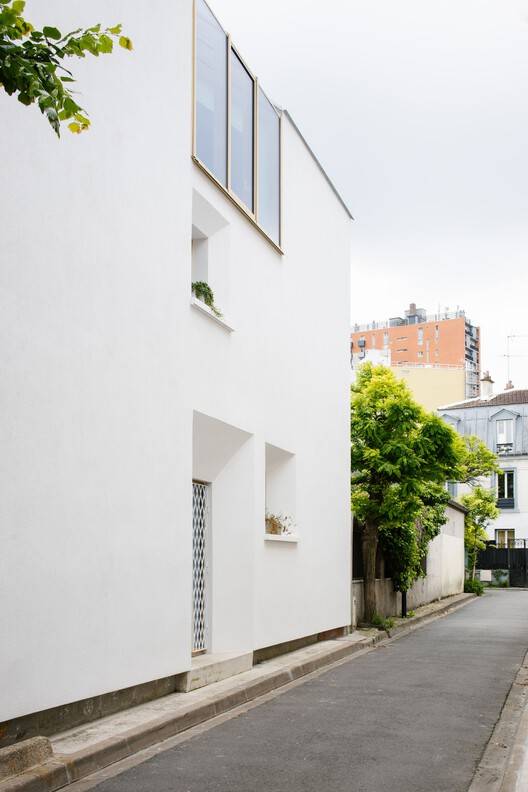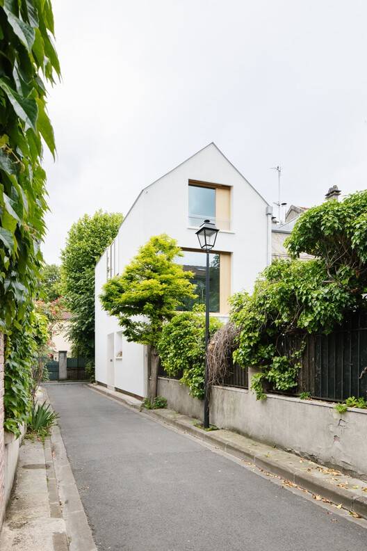 Text description provided by the architects. The project involves a wooden extension of a townhouse on the outskirts of Paris. From the outside, the silent and modest architecture blends into its environment while presenting a singularity that asserts its contemporaneity.