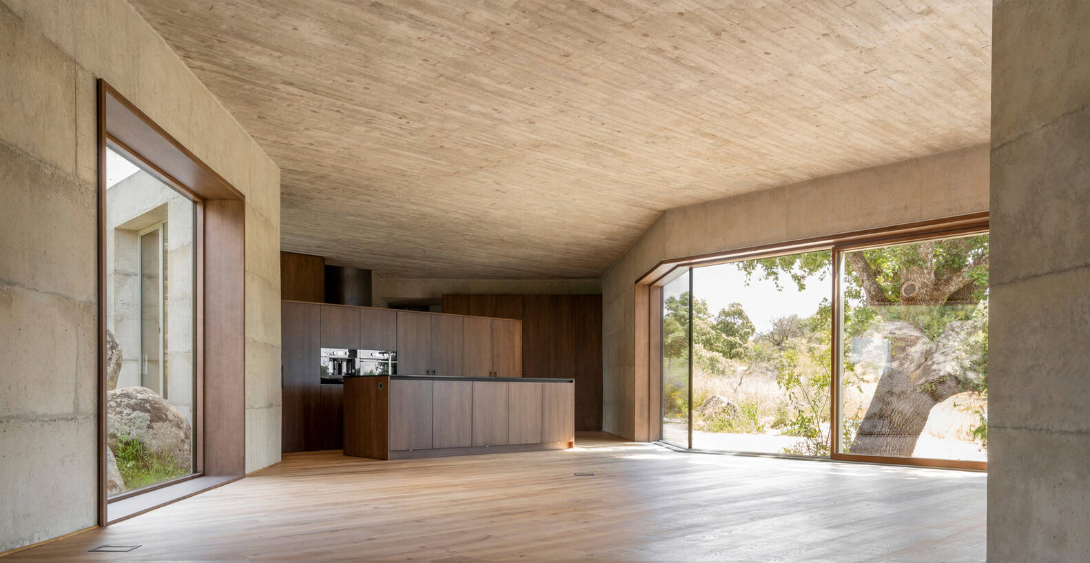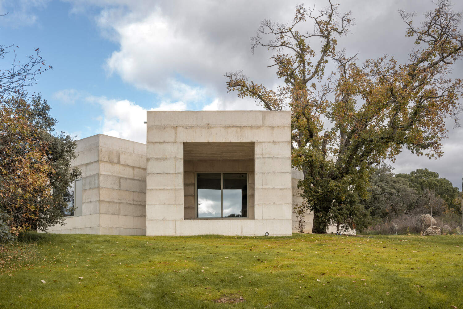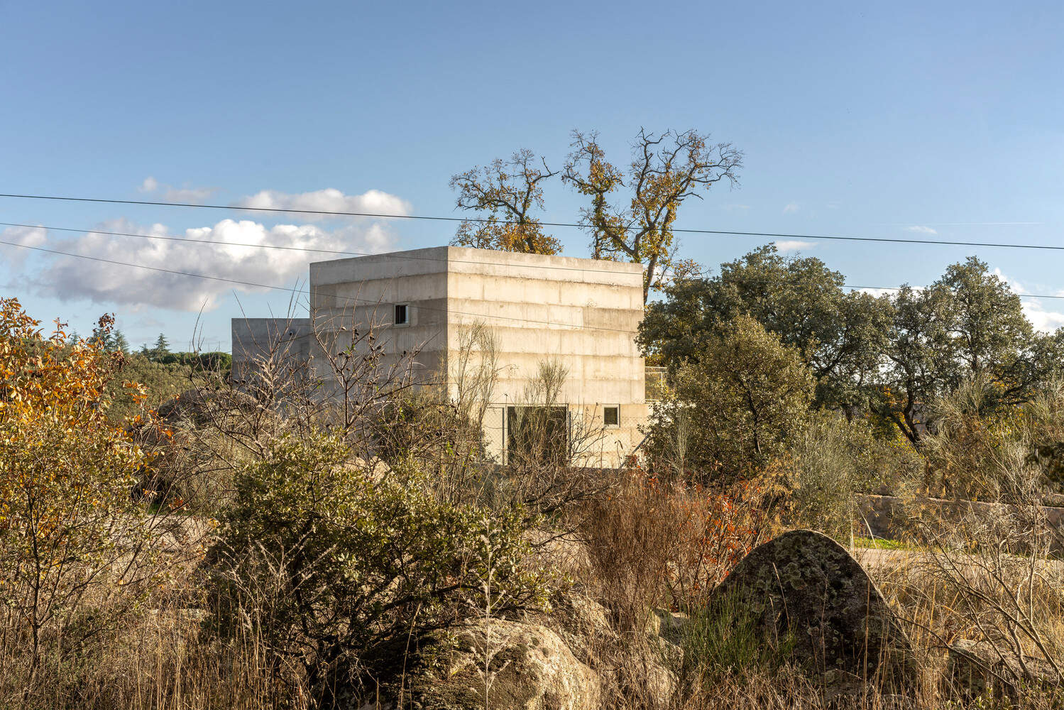 The rocky terrain on which the house sits is characterized by gentle topography and the imposing presence of a centenary oak surrounded by holm oaks and cork oaks that grow among large granite boulders. Among all these stony and vegetative elements and learning from the Ugalde house by Coderch, the house manages to find its place with a layout in the shape of an X that accommodates the program in the rugged landscape, while framing the views of those features from its interior.