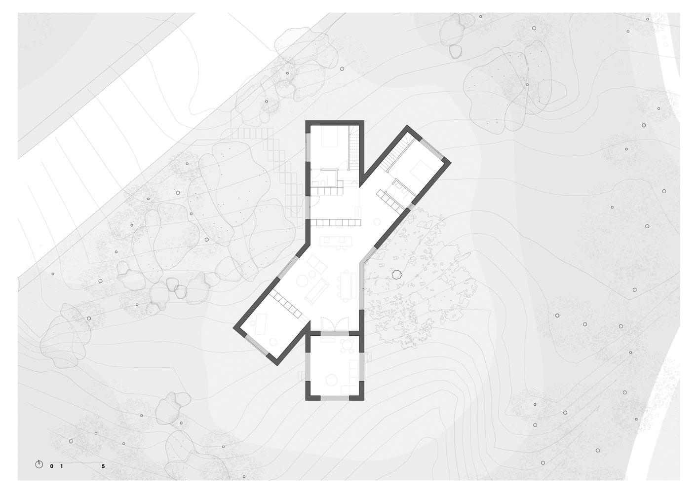 景观融合的典范:X栋建筑最令人印象深刻的特质在于其对环境的深刻理解和巧妙融入。建筑师并没有将房子简单地放置在景观之中,而是力求将其打造为“风景”的一部分。这种设计理念体现在建筑的选材、布局和建造方式上。建筑师选择使用当地材料,尤其是现场浇筑的混凝土,这种材料的耐久性与周围花岗岩巨石的坚固性相呼应,使得建筑在视觉上与自然融为一体。建筑的X形布局既满足了功能需求,又最大限度地利用了景观资源,实现了室内外景观的完美融合,这充分体现了设计者对场地特性的深刻理解。