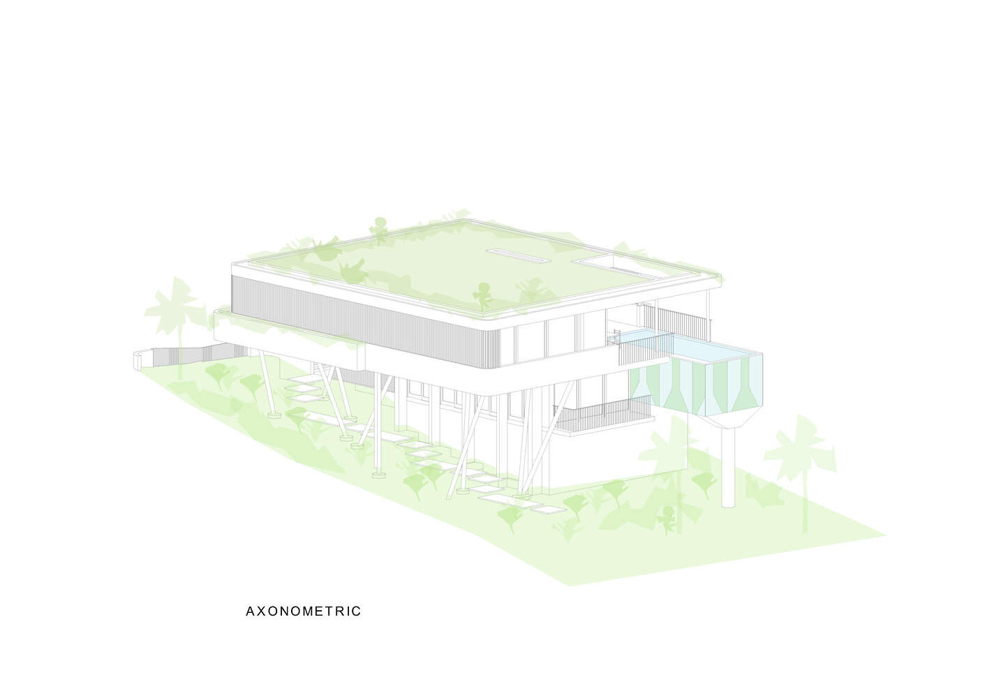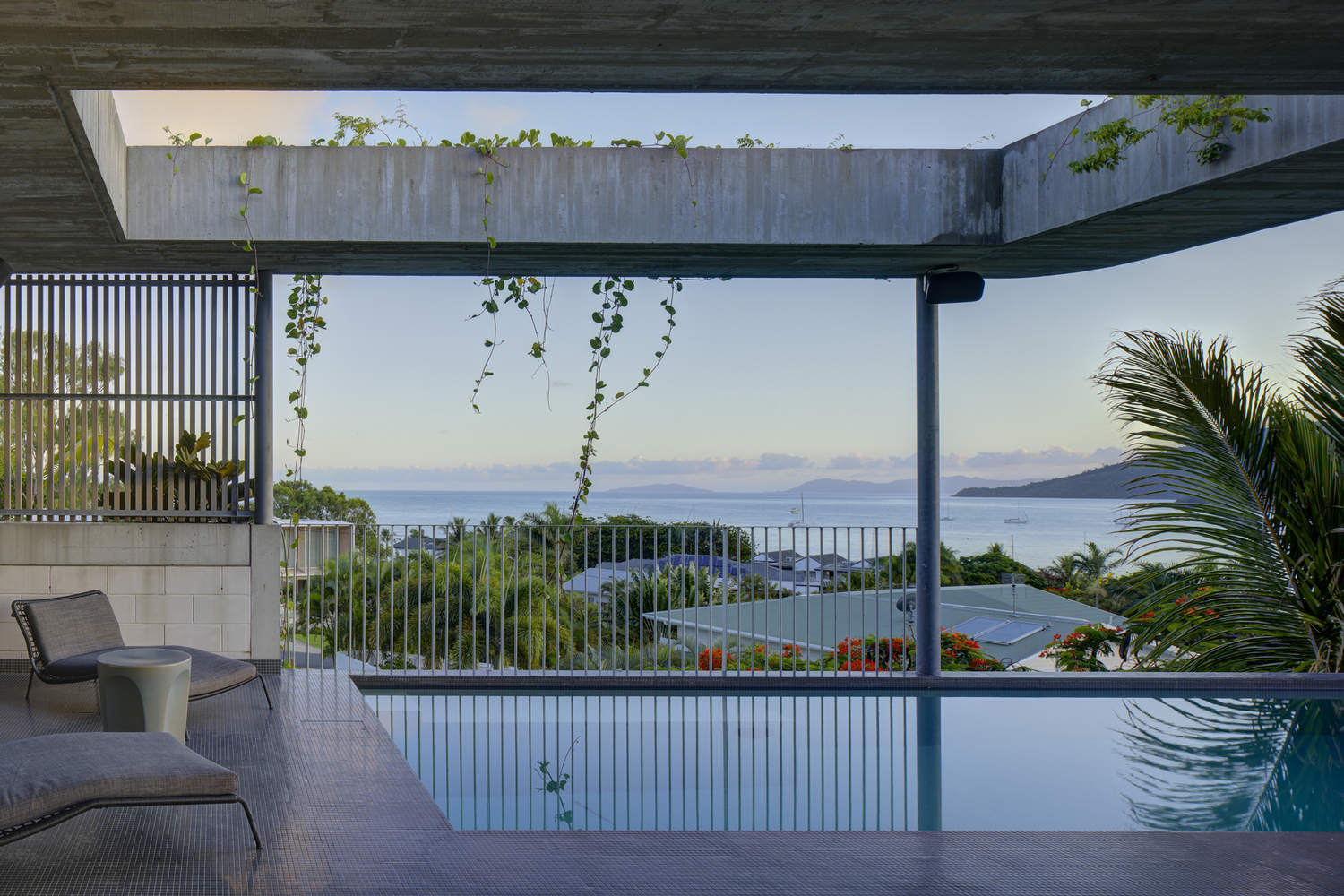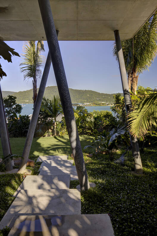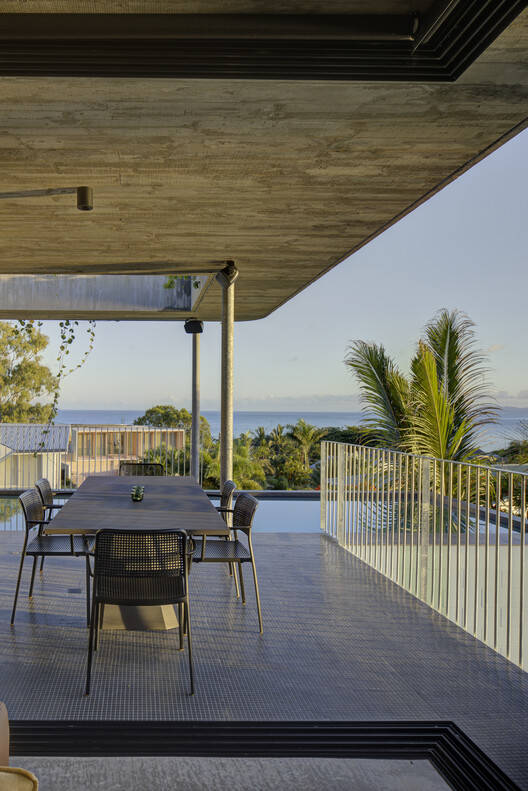 因此,房子的主要客厅和卧室空间尽可能高,以捕捉海风。这些空间的边缘有木制遮蔽阳台,有时只有600毫米宽,但可以提供阴凉并最大限度地增加空气流通。几乎所有的内部空间都通向这些阳台,有巨大的可操作侧门,即使是最小的微风也能进入家中。阳台和巨大的屋顶悬挑,模糊了内部和外部空间的边缘,营造出一种开放、轻松的氛围。将游泳池高高地放置在这一层,可以与远处的珊瑚海和主要生活空间建立真正的联系。