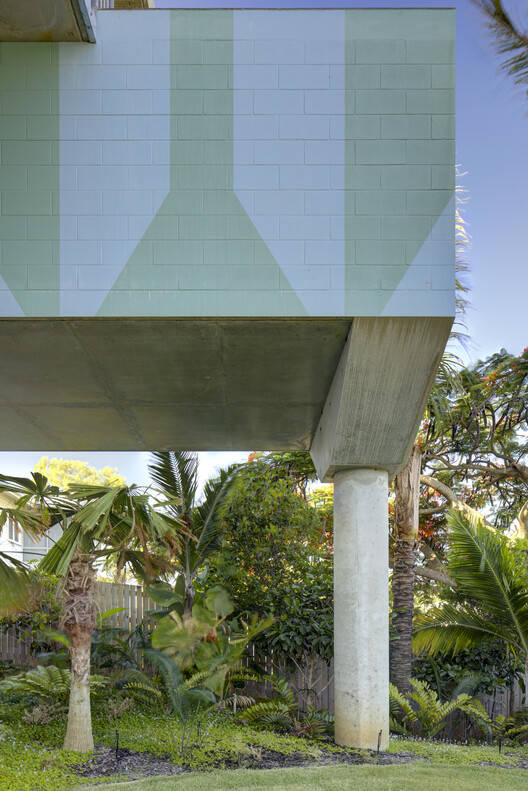 房子的地面以一个阴凉的下层空间为特征,该空间为进入建筑物提供了较冷的空气,同时也允许从街道穿过房子看到外面的大海。支撑上方混凝土地板的摇摇晃晃的斜柱是对该地区前滨常见的She Oak树的微妙参考。undercroft交错的超大台阶让人们可以坐在外面的绿地中,阅读或喝啤酒,边走边与当地居民交谈。