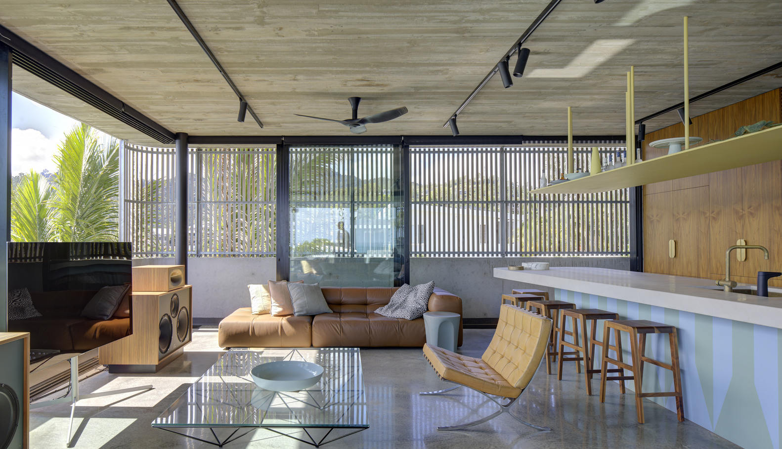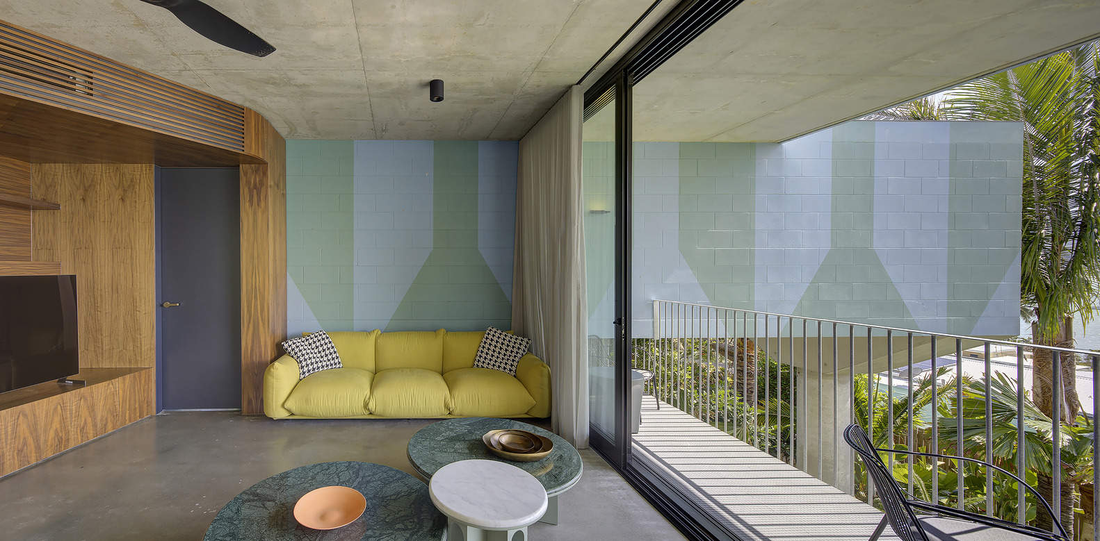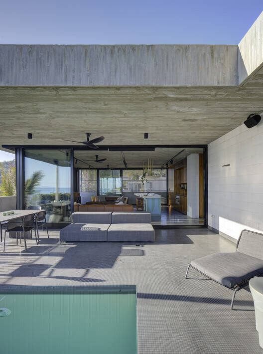 木屏风与阳台的一米高的混凝土仰墙不仅提供了遮荫,还为邻居提供了遮蔽,有助于将房子与外面的天空和大海的景色融为一体。