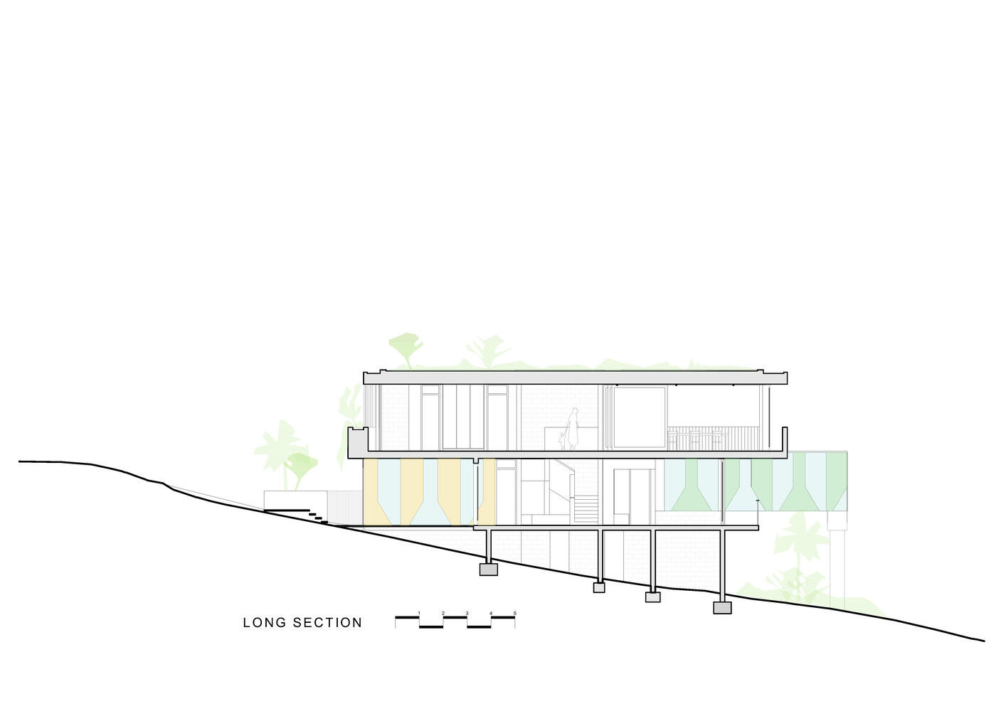 The ground level of the house is characterised by a shaded undercroft space that provides cooler air to enter the building but also allows views from the street through the house to the sea beyond. The wonky, angled columns supporting the concrete floor above are a subtle reference to the She Oak trees that are often found on the foreshores of this area. The staggered, oversized steps in the undercroft allow people to sit outside ensconced in the greenery, to read, or to have a beer and talk to local residents as they walk by.