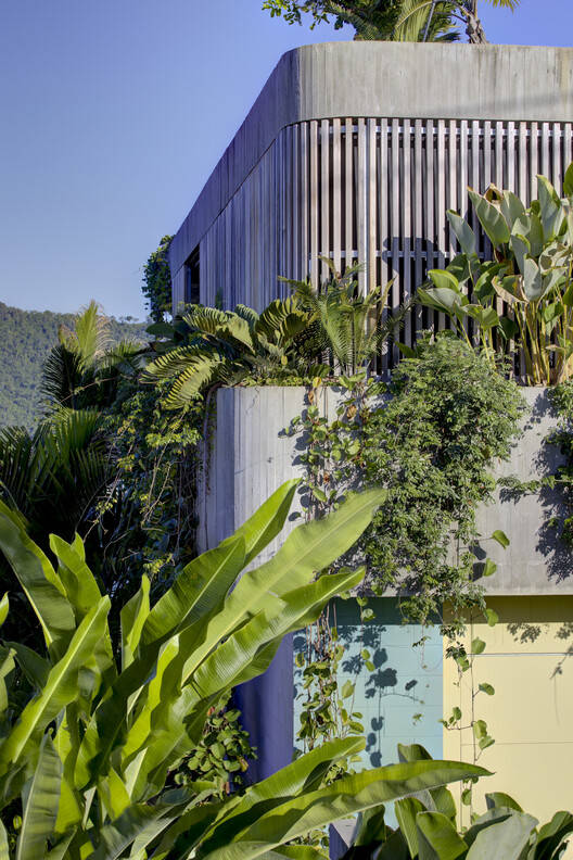 我们和景观设计师一起,一直在讨论丛林中废墟的想法。蕨类植物、棕榈树、草和树木占据了屋顶、地下空间、墙壁和地面。根据红树林根部的形状开发了一个三角形图案,它在水线下形成一个扶壁,在大风中提供稳定性。该主题被抽象并绘制在厨房、游泳池外墙、入口通风道甚至车库门的表面上,作为一种经济高效的处理方式。