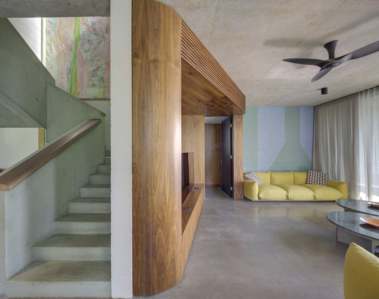主楼梯与黄铜扶手的混凝土混合中加入了一种坚实的白垩色薄荷绿,这是出乎意料的、俏皮的,但同时又经久耐用。用于形成混凝土天花板的真木衬板通过反射的光线和阴影创造出银色且不断变化的纹理。你不会从假木模板衬里中得到这种东西,它很微妙,随着时间的推移,你会慢慢欣赏它。