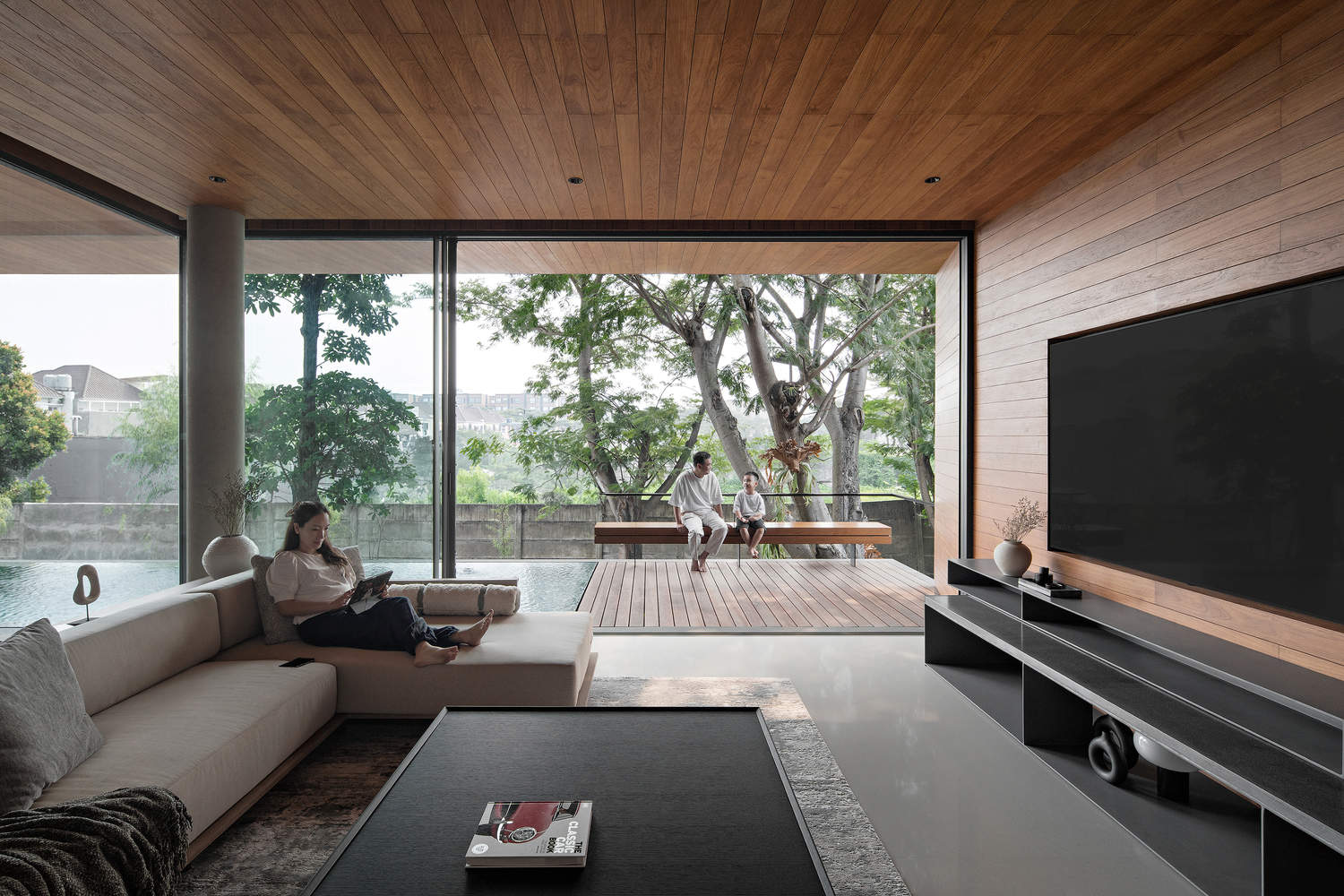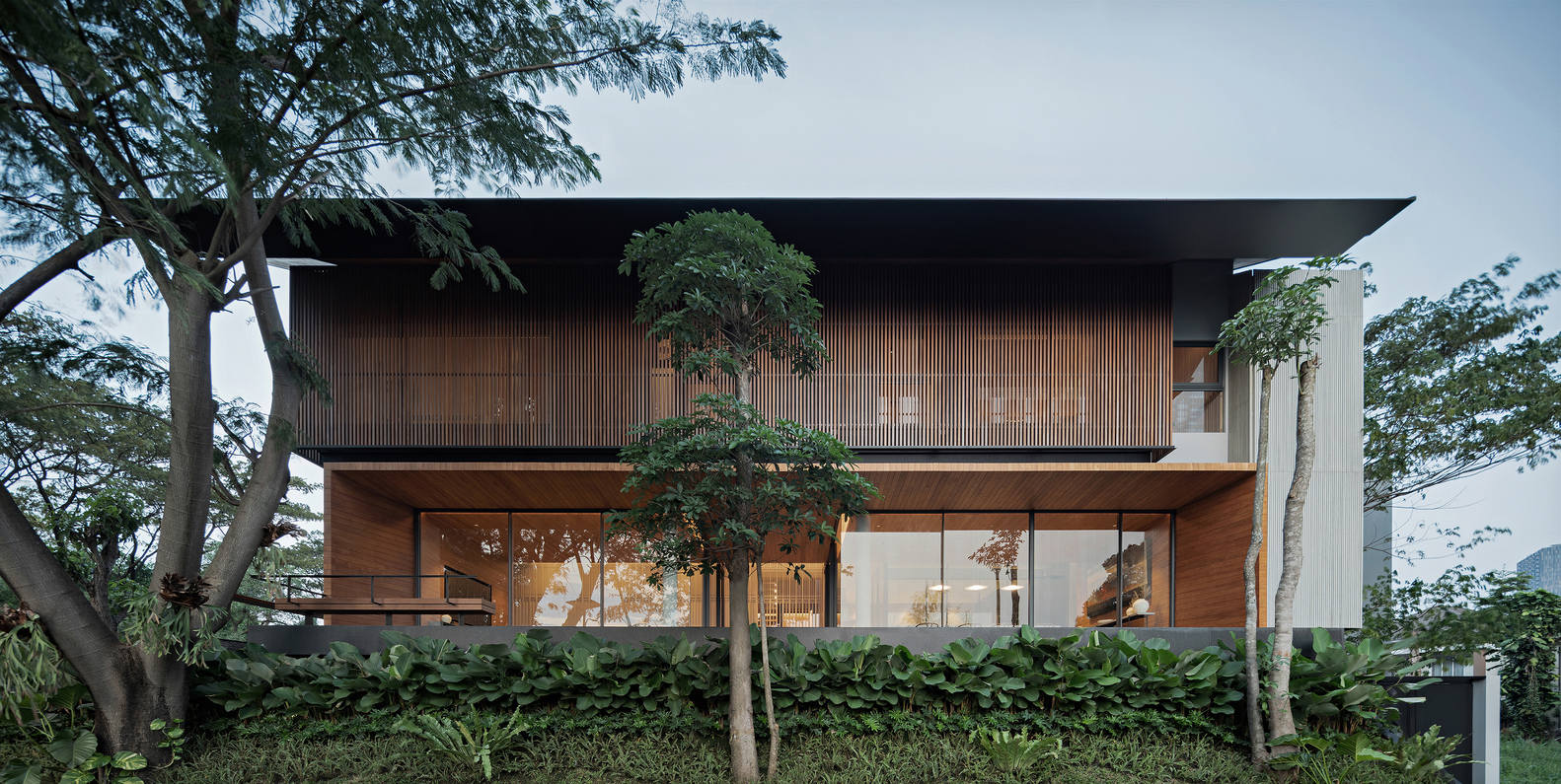 A modern tropical approach with an overhanging roof provides protection against tropical sunlight and rain. Both try to breathe separately about vernacular architecture, create a relationship between walls and non-walls, and still use flexible open-close-motif panel dividers to connect the interior and exterior spaces.
