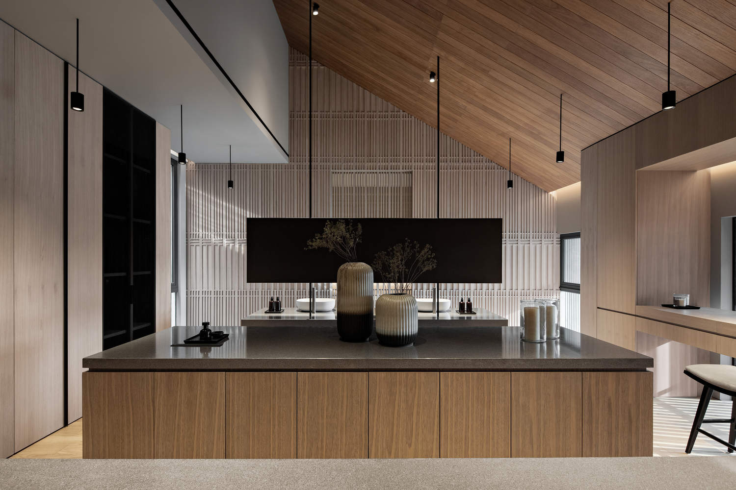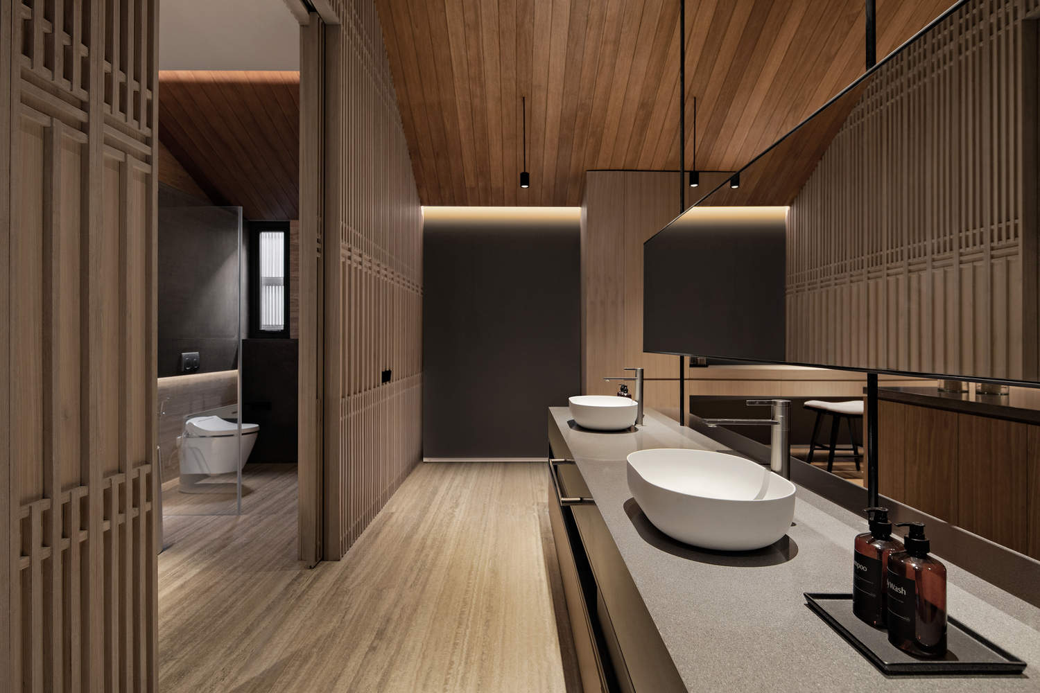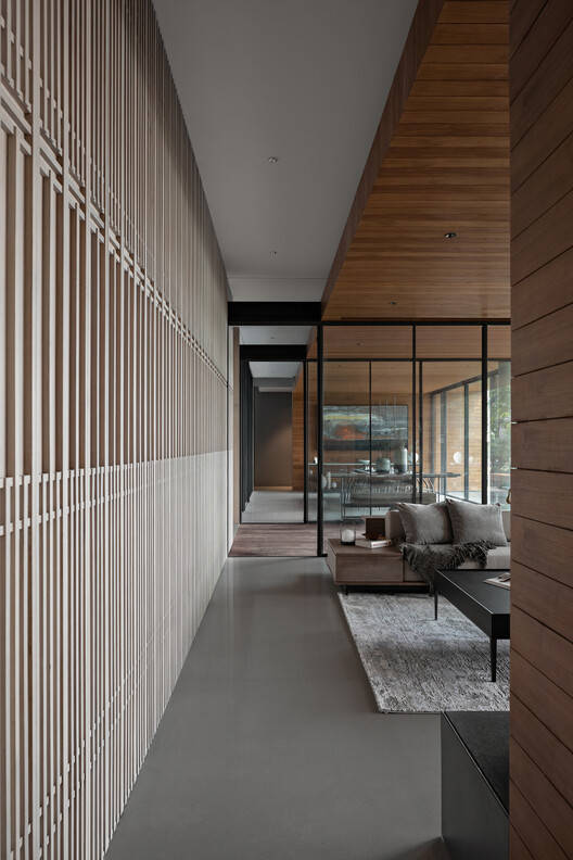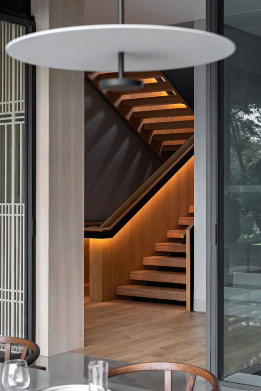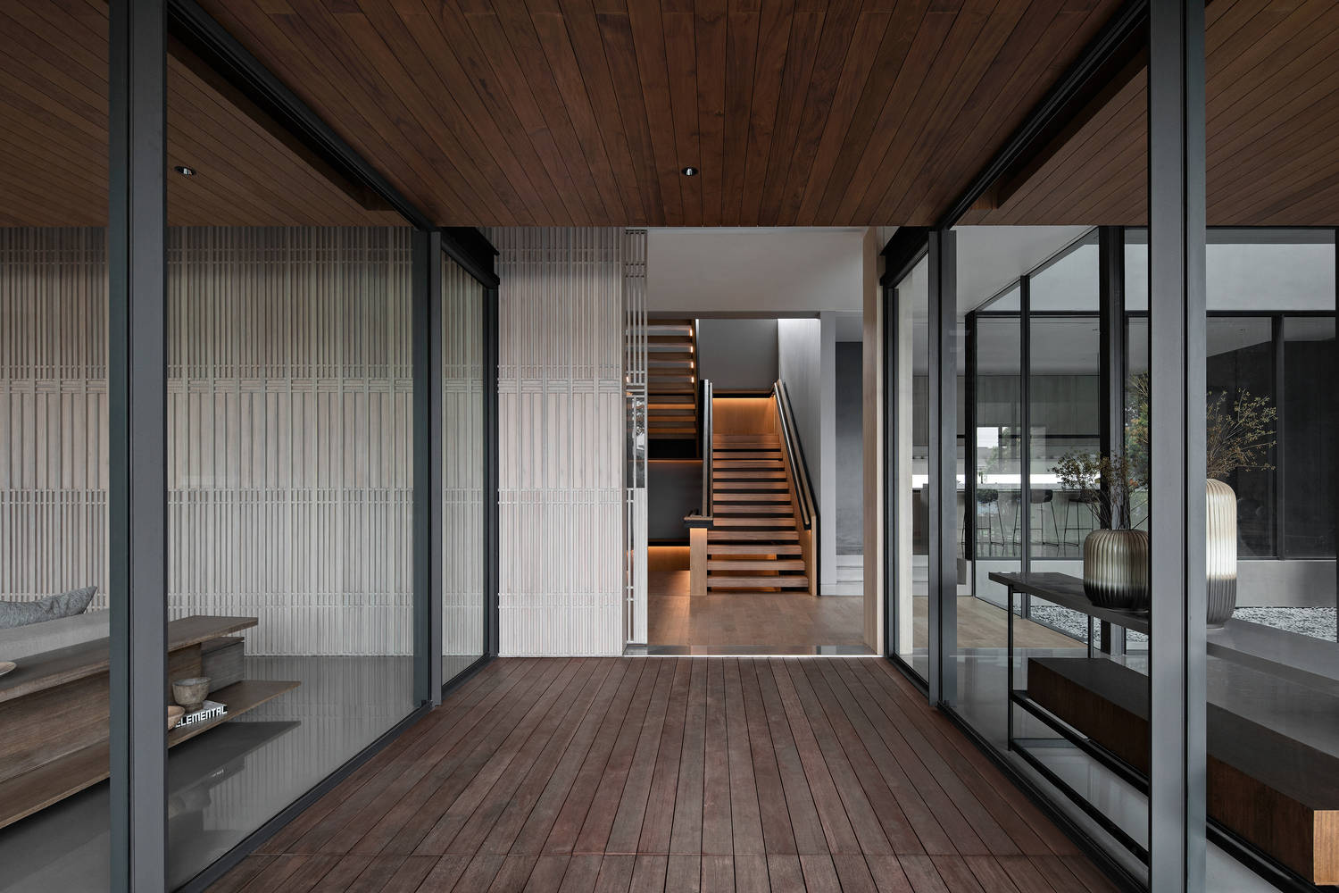 The difference between floors with a slight split level provides different visuals and ceiling heights for each room. The wooden terrace helps separate the rooms from each other and has direct access to the swimming pool. The central area of the house is connected to the dining room and clean kitchen with a light void in the middle.