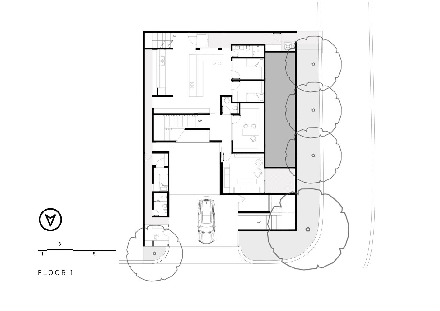 The interior of the house is designed to be open and spacious with four zones and cross circulation where the main stairs are placed. The functions on the 1st floor are the living room and office, as well as the service area with separate door access from the north and west sides of the road.