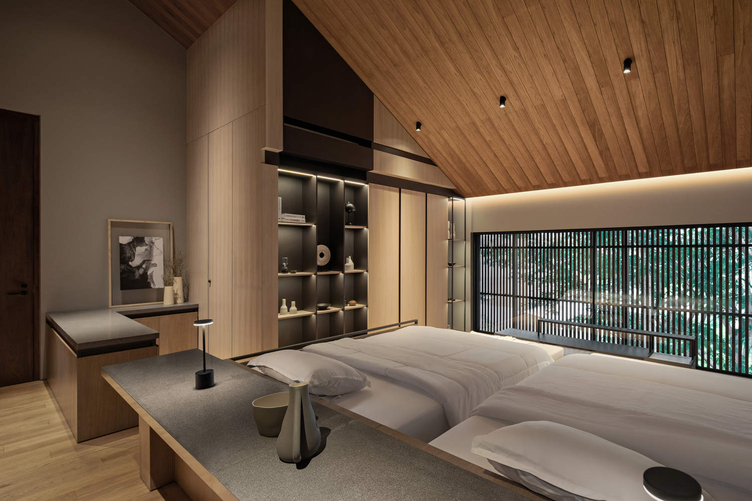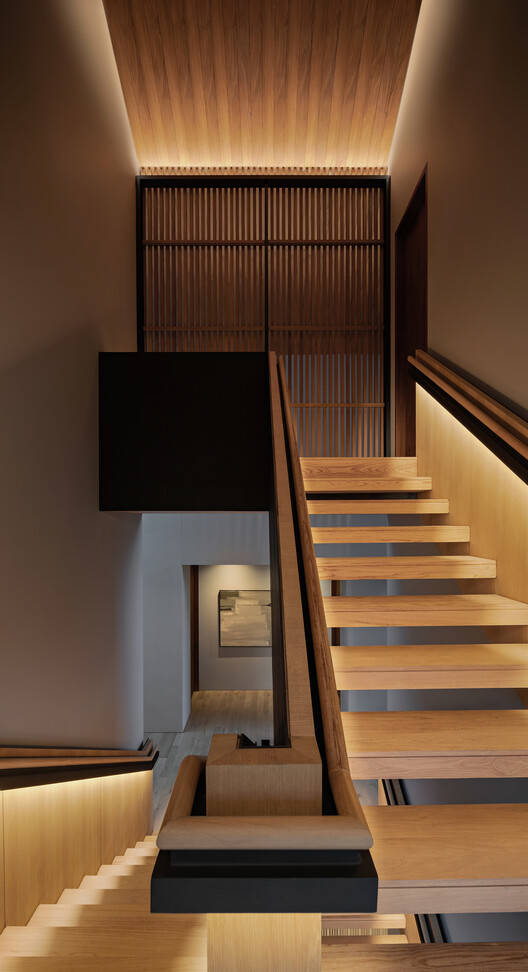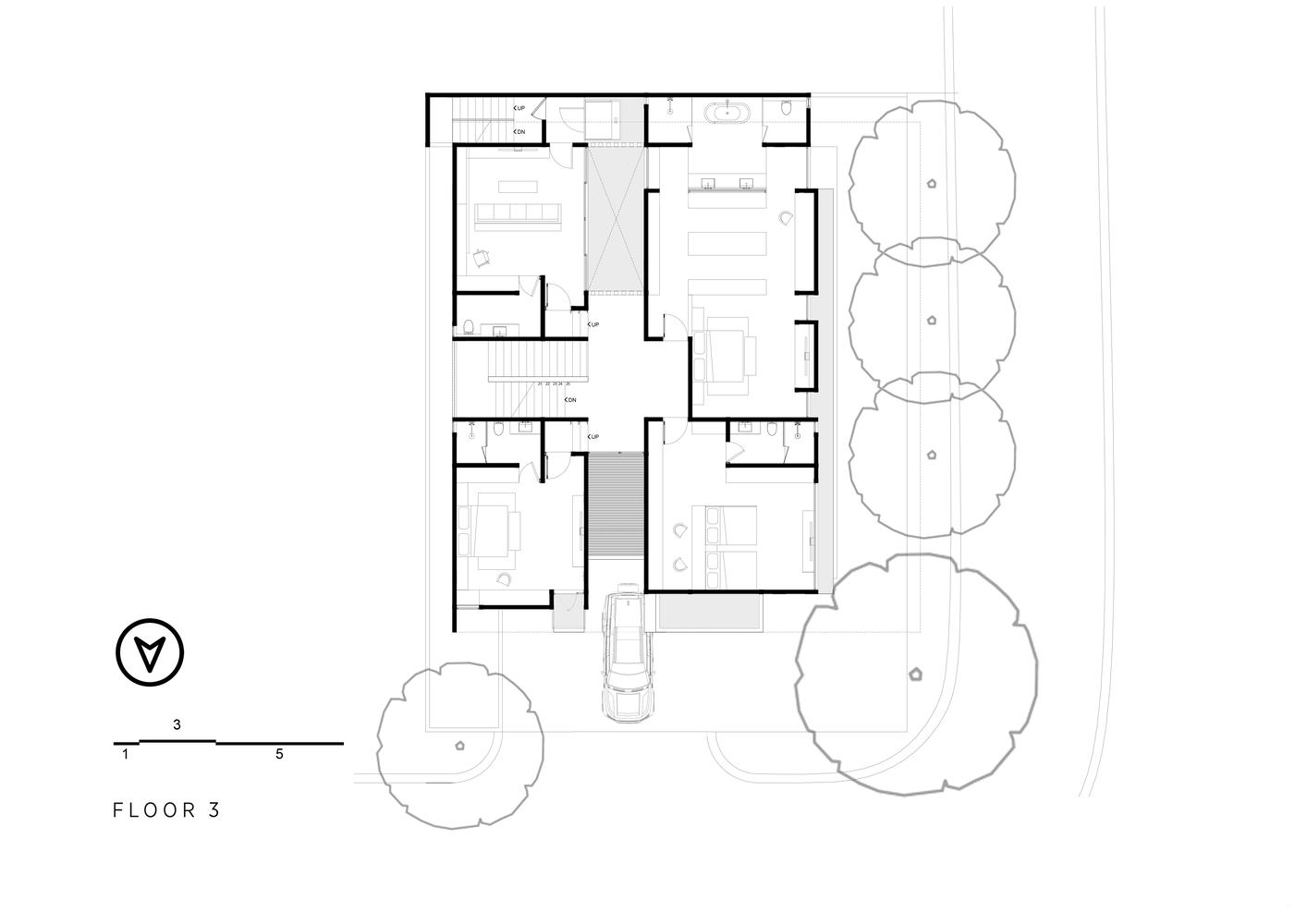 在三楼,每层的房间都可以通过有效的流通路径相互连接。三楼的上墙与西侧的多功能厅和主卧室融为一体,采用宽窗设计,但被长长的屋顶屋檐遮蔽。从窗户望出去,你可以看到日落,而不必感到灼热,也不必被它的光线所迷惑。