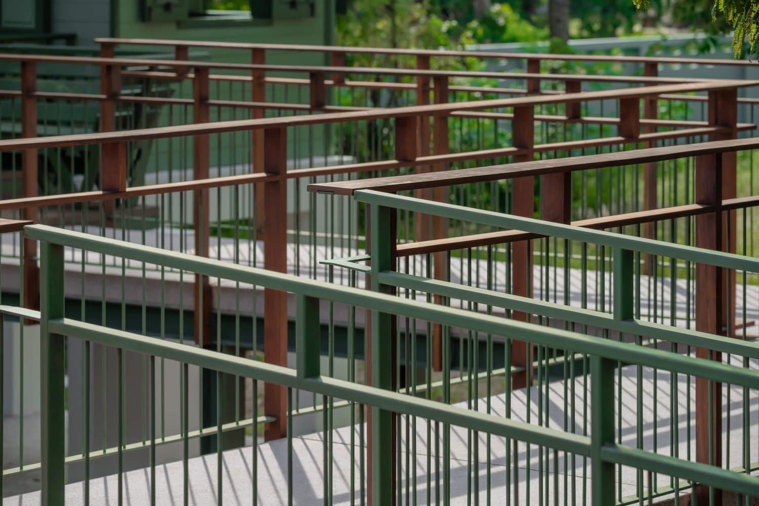 The original walkway was made of aged white wood. We demolished and rebuilt it entirely, enhancing its design to better integrate it with the space between the two buildings. The new walkway design forms a flipped L-shape to connect the entrance of the hip-roofed house with the rear side. The walkway was previously attached to the front entrance of the hip-roofed house, obstructing the building. With the redesigned walkway, a rear balcony area was created, serving as a cozy sitting spot. We also added an outdoor restroom for continued access from the walkway.