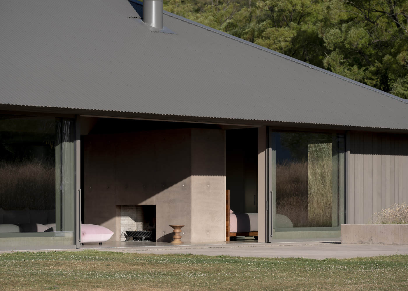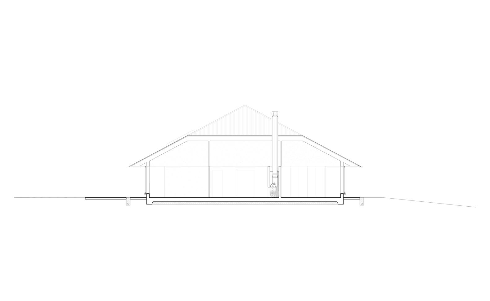 A square plan and corrugated roof reference historical structures of the region - such as minor's huts and agricultural sheds - with a rationalised grid to facilitate the opening and closing of interior spaces around the needs of the occupants. The plan establishes a continuous field within which several heavy concrete volumes provide groundedness among the collection of interchangeable spaces. A large open fireplace anchors the building's centre - pushing up from the ground, these solid concrete masses function as an extension of the mountainous terrain, the foundation atop which a collection of cedar boxes huddle under a simple metal roof.