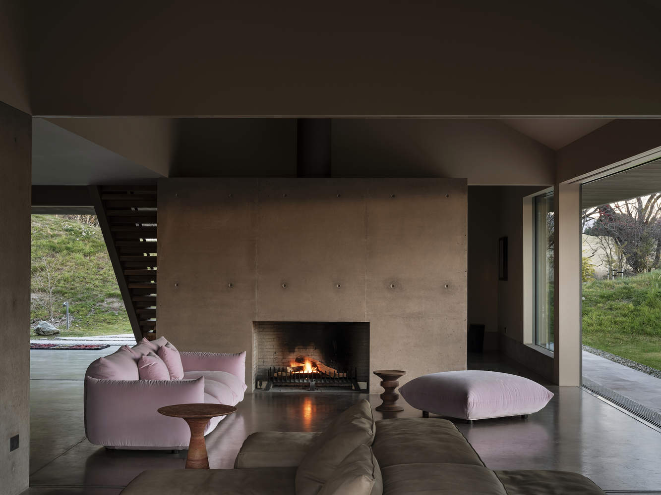 空间流动的极致:项目在空间处理上的精妙之处在于它对“必要”的极致追求。 通过与Matheson Whiteley的合作,设计师将空间动态限制在最基本的尺度,从而将重点放在居住者与自然环境的互动上。 开放式壁炉作为建筑的中心锚点,向上延伸,仿佛是山地地形的延伸,将室内空间与室外景观紧密联系。此外,建筑师巧妙地运用滑动门和可灵活组合的木质屏风,模糊了室内外空间的界限,营造出一种流畅、开放的居住体验。这种设计手法提升了空间使用的灵活性和可能性,赋予了住宅更强的生命力。