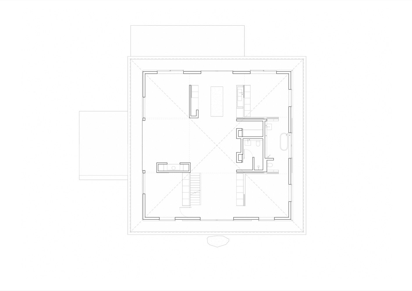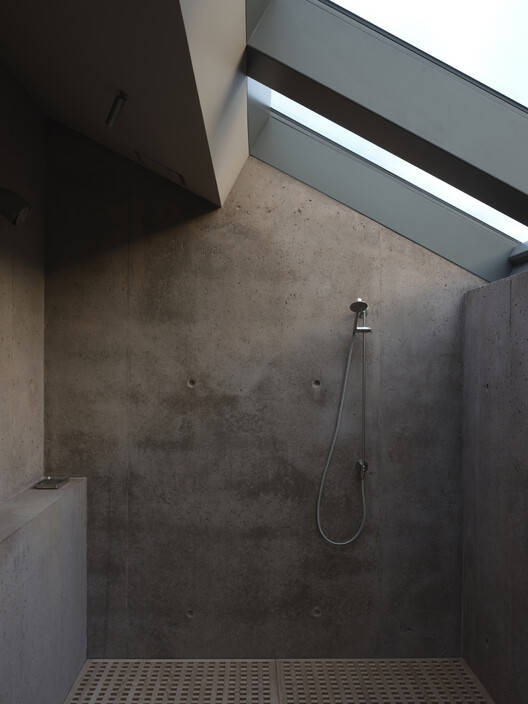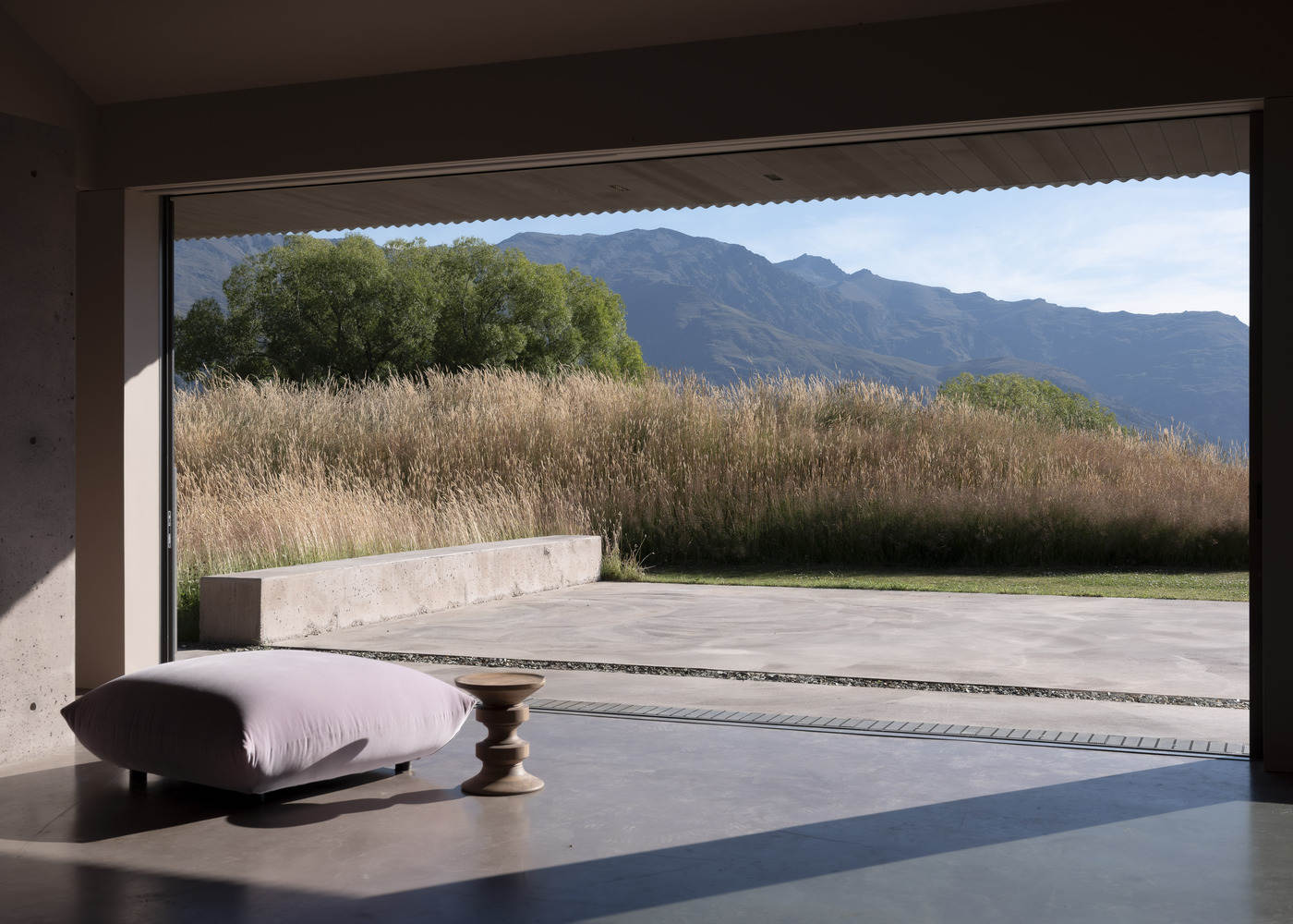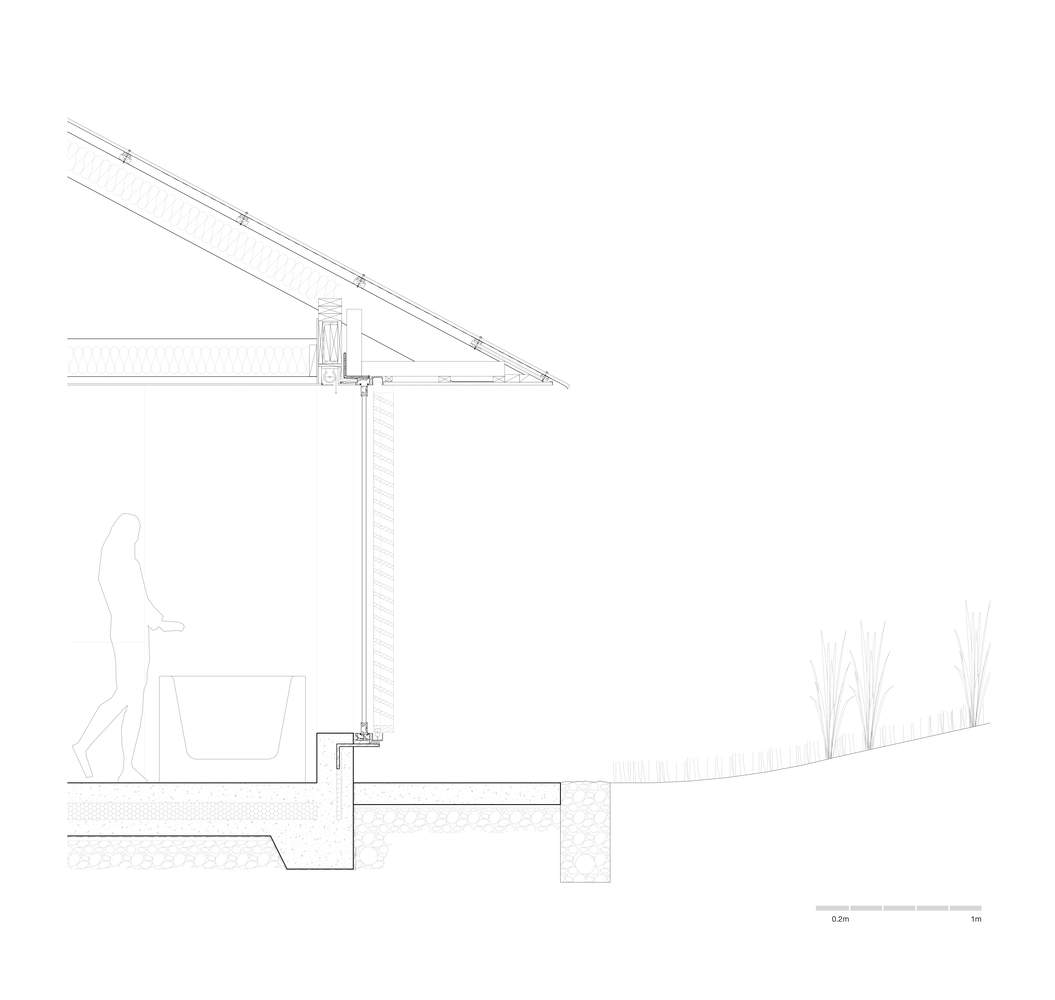 An interior perimeter, akin to the traditional japanese en, frees the exterior walls and gestures to an interval, a pause, an extended threshold. Concealed pocket sliding doors operate within this zone, integrating into the solid masses and committing the threshold to an openness that mirrors that of the surrounding exterior path. A low concrete upstand mediates the centre line of the perimeter threshold, providing definition and emphasis within the continuous field. This upstand supports an exterior track system upon which large oversliding glazed doors and timber screens glide, appearing to lightly hover above the ground. When open, the concrete upstand remains while the joinery stows precisely adjacent, at once becoming a fixture of the wall itself, blurring the distinction between the permanent and dynamic.