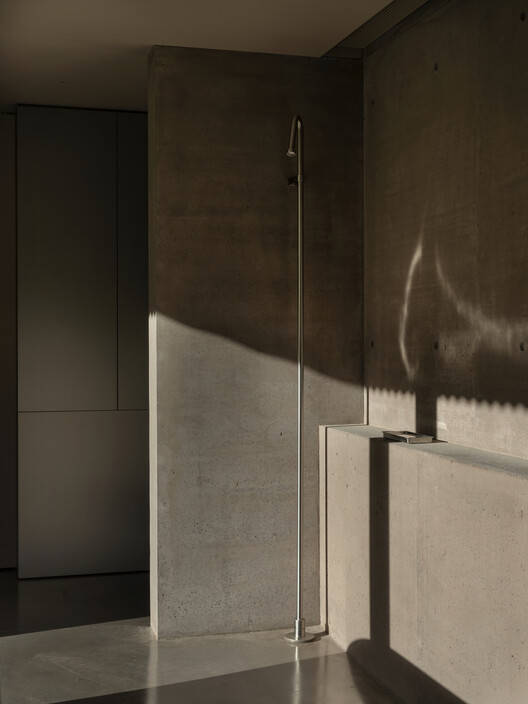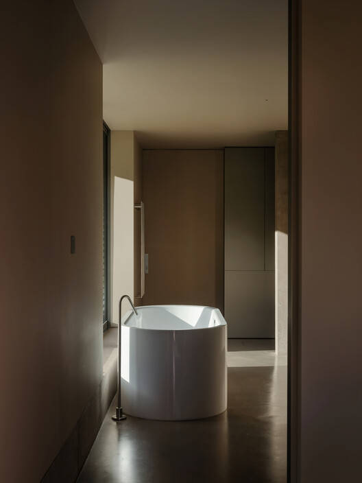 一个类似于传统日本en的内部周界,将外墙和手势释放到一个间隔、一个停顿、一个延伸的门槛。隐藏式口袋滑动门在该区域内运行,融入固体物质中,并将门槛设置为与周围外部路径相对应的开放度。一个低矮的混凝土竖立物位于周界阈值的中心线之间,在连续的场地内提供定义和强调。这个竖立物支撑着一个外部轨道系统,大型的超滑玻璃门和木屏风在其上滑动,看起来像是在地面上轻轻盘旋。当打开时,混凝土竖立物仍然存在,而细木工制品则恰好相邻,立刻成为墙壁本身的固定装置,模糊了永久性和动态性之间的区别。
