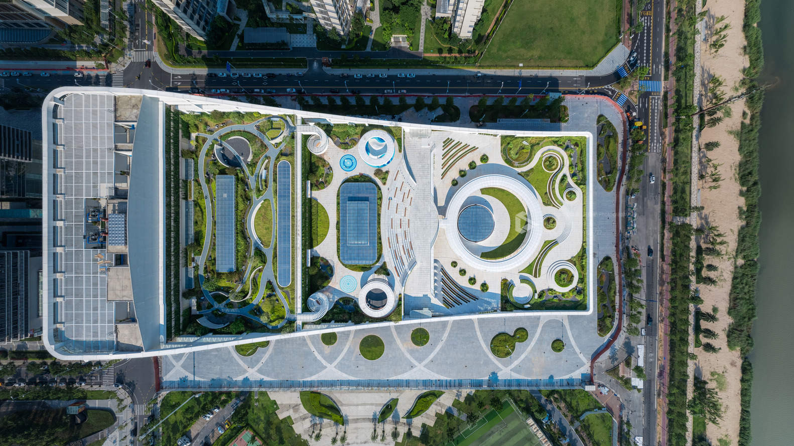 Integrated landscape and vistas - With its inspirations often derived from nature, Yunchao Xu/Atelier Apeiron has incorporated natural prototypes into its design of the Hengqin Culture & Art Complex, including terraces, caves, and cliffs. A stacked, four-story arrangement of rooftop platforms provides stunning publicevents. In designing the gardens, the firm conducted multiple studies to ensure optimal sightlines from each of the platforms.The base platform includes a semicircular stage and a circular auditorium, where the Macau Wedding Company will organize large-scale weddings,birthday parties, corporate team-building activities, and much more. At 24 meters, a platform designed as a children's theme park features sand pits, expansive play facilities, restaurants, museums, and family cafes. At 30 meters, another platform provides a shared garden, with the addition of staff canteens and cafeterias for employees to rest and enjoy their environment. Finally, rising 36 meters, a rain garden platform serves as anenvironmental zone, integrating ecology, a low carbon footprint, and green technologies as a sort of ecological laboratory. A spiral staircase invitesvisitors to ascend to a bamboo garden, where serenity and quiet moments can be experienced while enjoying a cup of tea adjacent to the SkyBookstore.