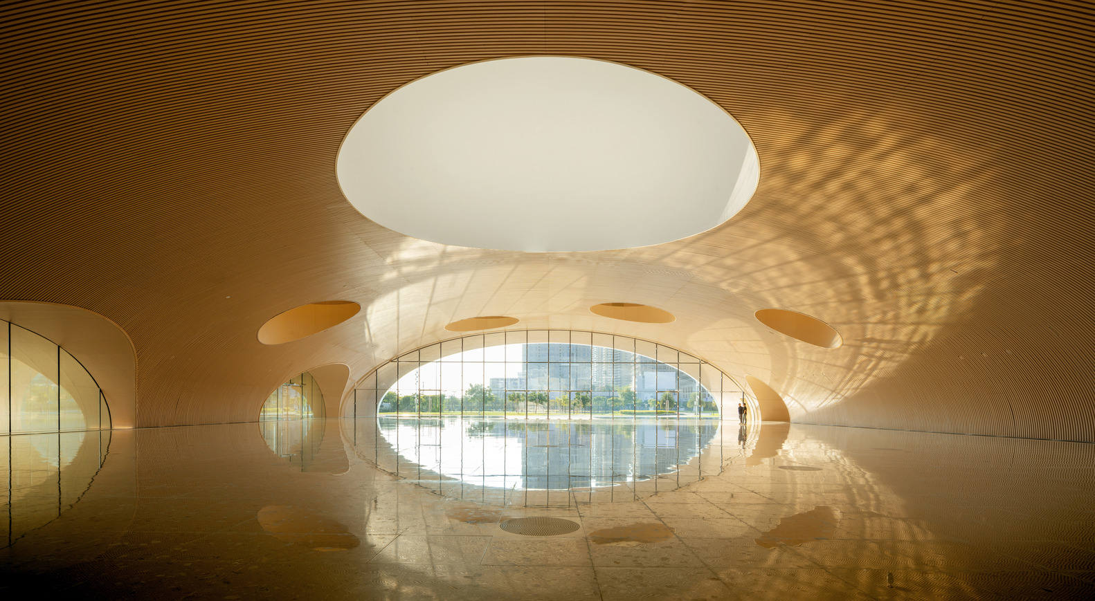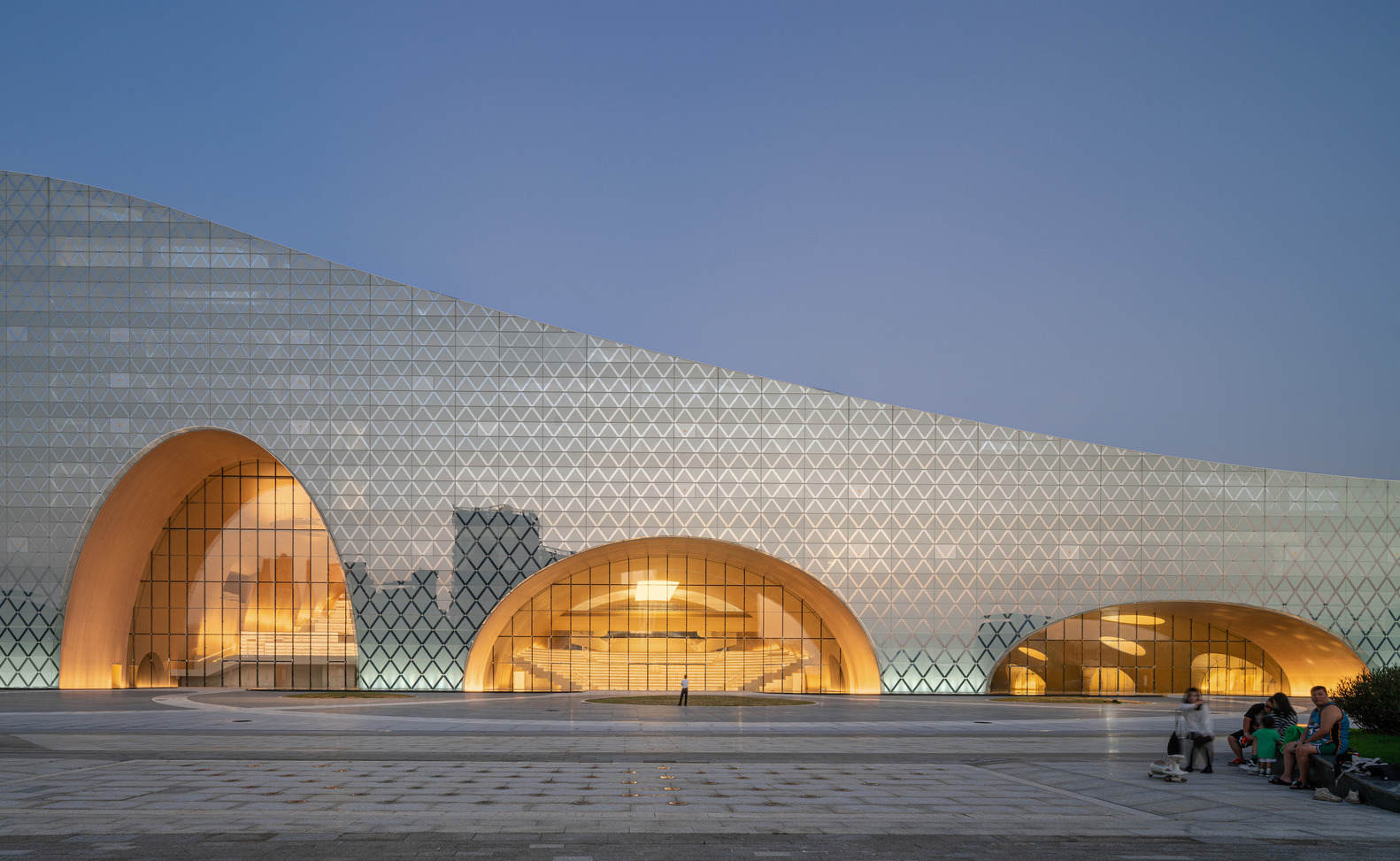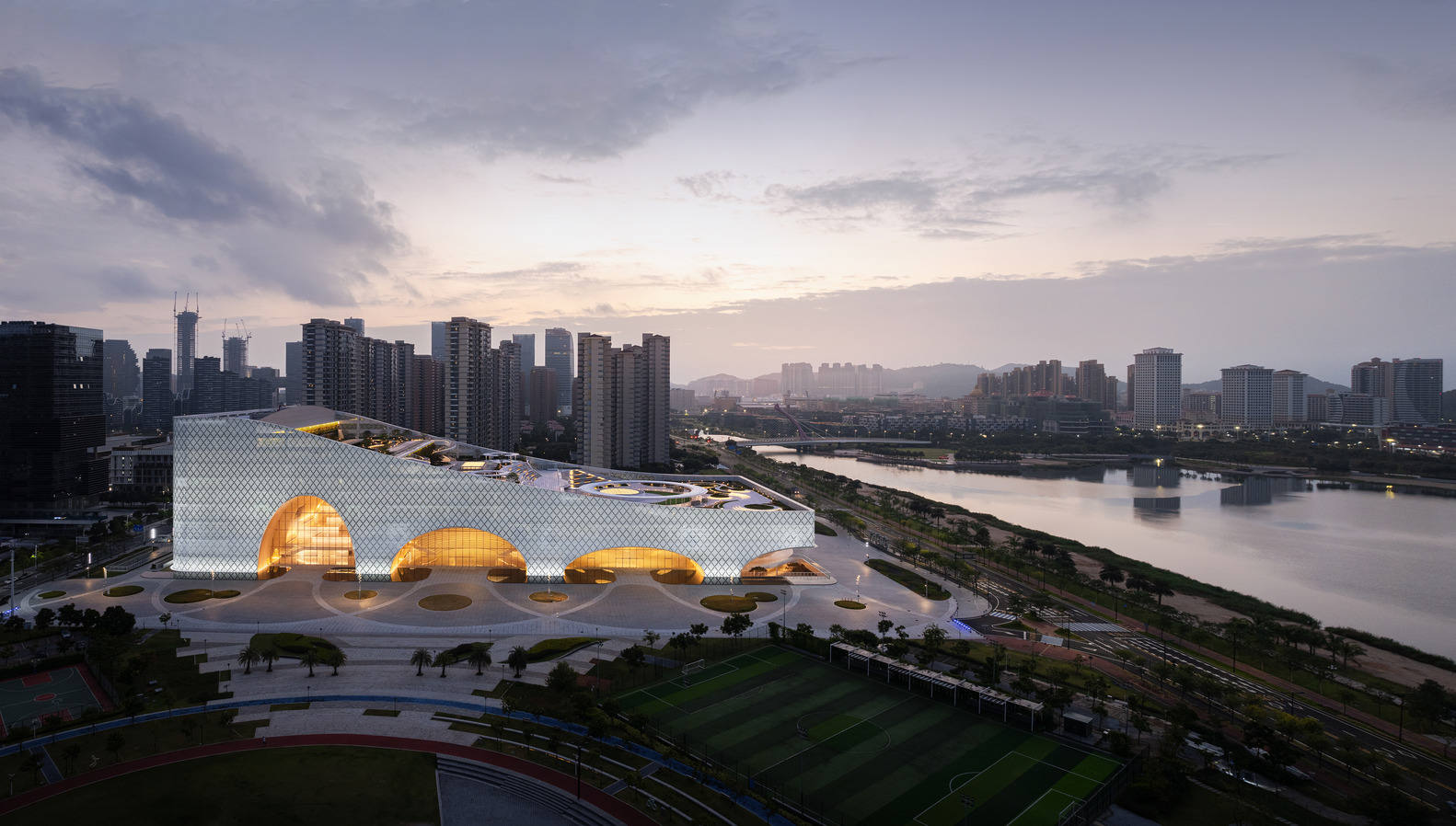 A glittering landmark in a new skyline - Extending from a hill to the north, to a river to the south, the catenary curve of the Hengqin Culture & Art Complex has created a new skyline landmark. With the design of the Hengqin Culture & Art Complex, Yunchao Xu/Atelier Apeiron has embraced the experience of the multidisciplinary design process to evolve in its practice. In close collaboration with material scientists, botanists, climatologists, acoustic experts, and many other experts, the firm's experience and expertise have now been infused with a comprehensive understanding of the complexities of designing such large-scale cultural complexes. "This project is a milestone for our firm, and it opens new avenues for us to design innovative architecture in the future, based on more multidimensional thinking," concludes Yunchao Xu. "It has motivated us to expand the definition of architecture, and to push the boundaries of traditional design."